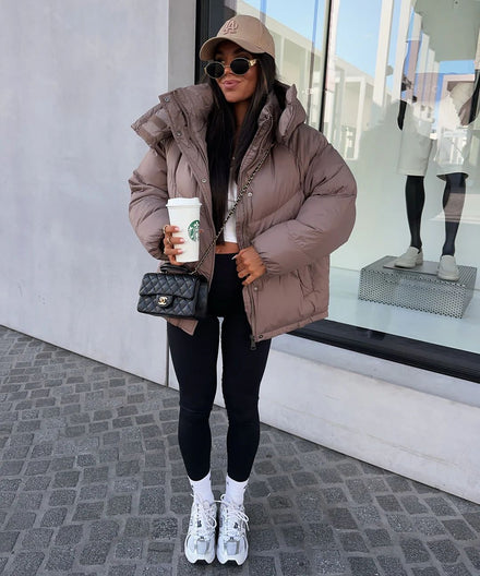 Phoebe Oversized Quilted Bomber Jacket with Hood - Taupe