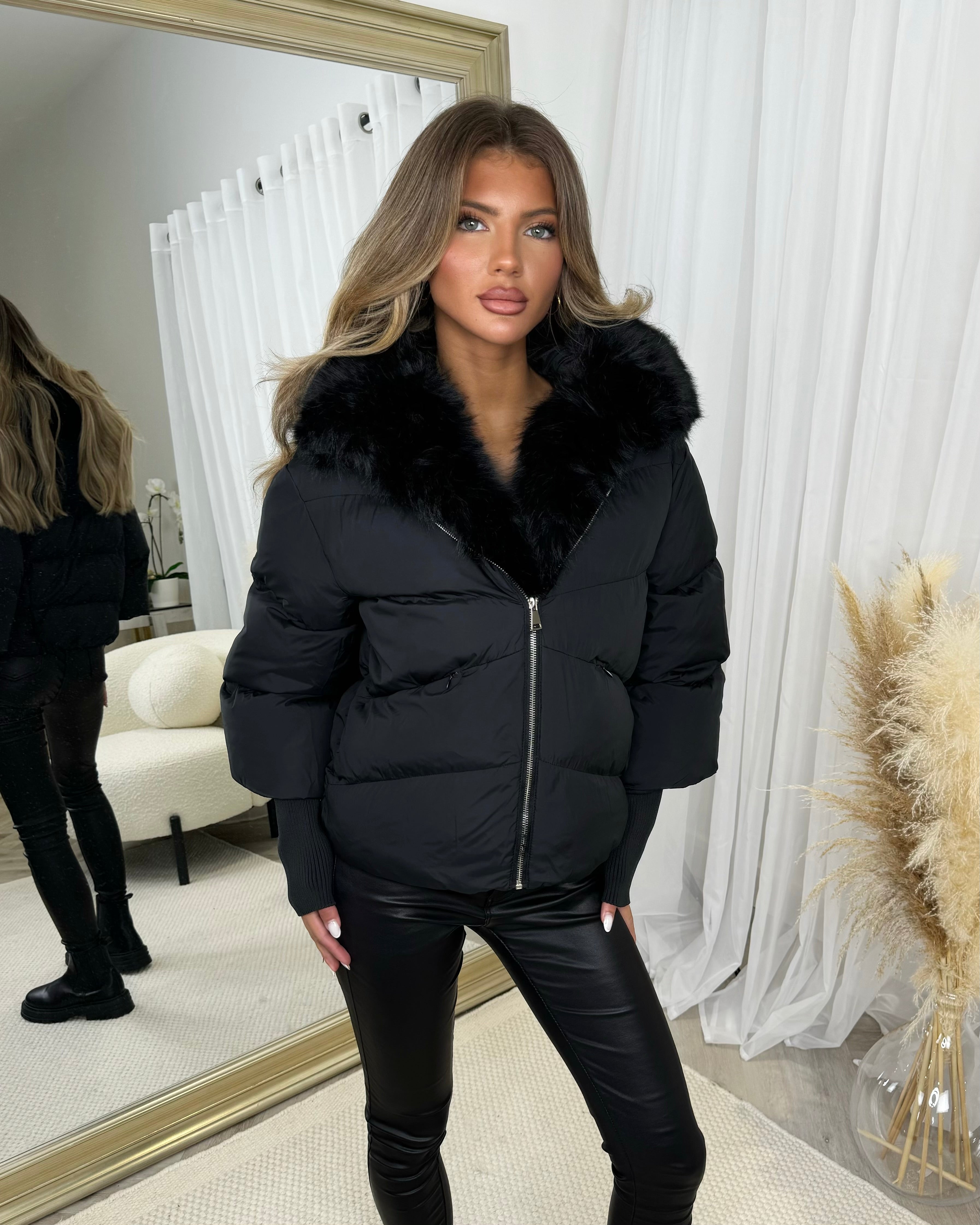 Ruby Hooded Padded Coat with Faux Fur Trim - Black