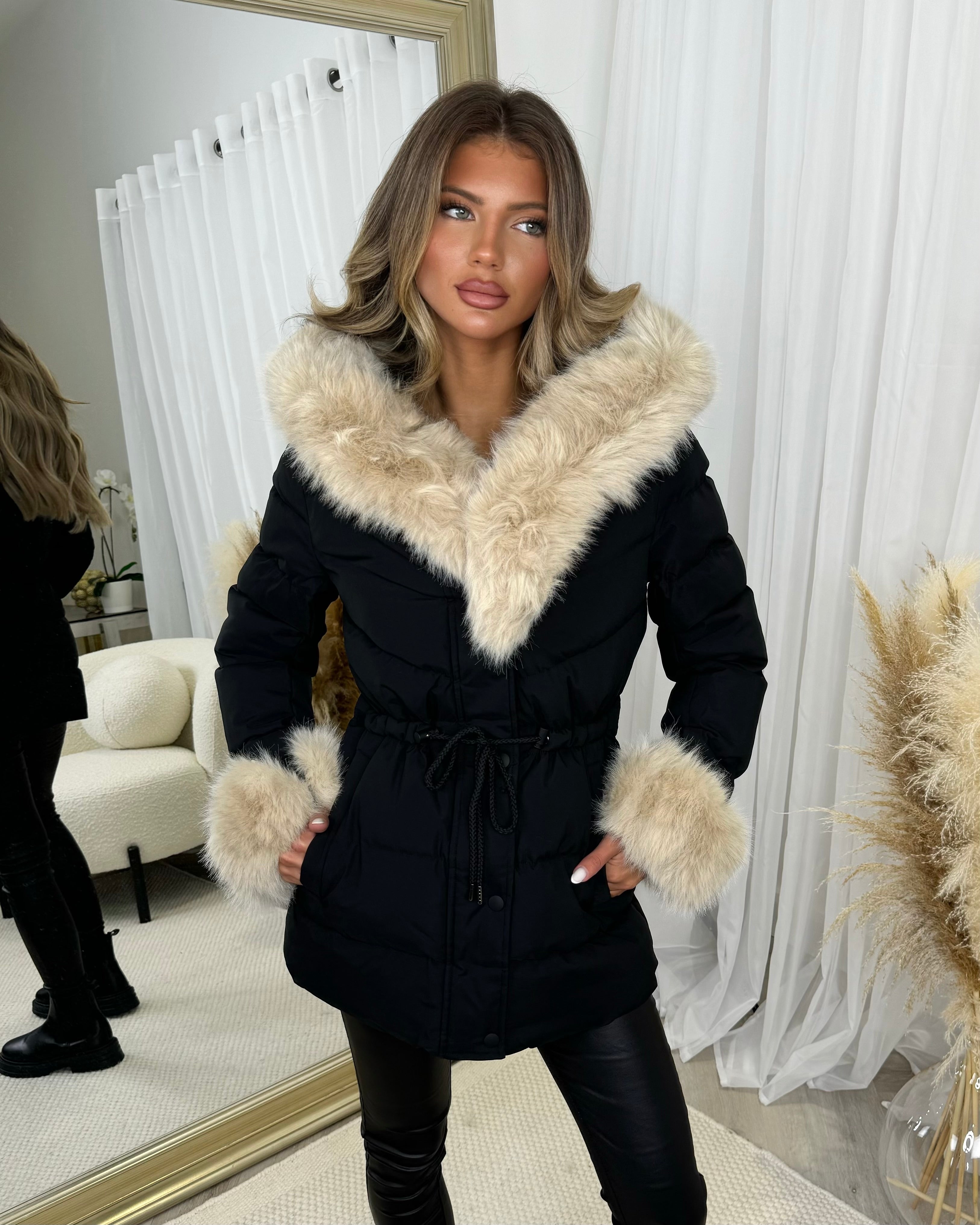 Klara Faux Fur trim Hooded Padded Coat- Black/Beige