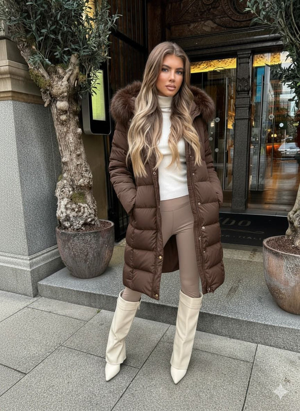Poppy Long Quilted Faux Fur Hood Coat - Chocolate