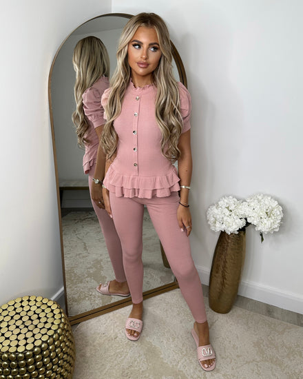 Kara Gold Button Frill Loungeset - Pink