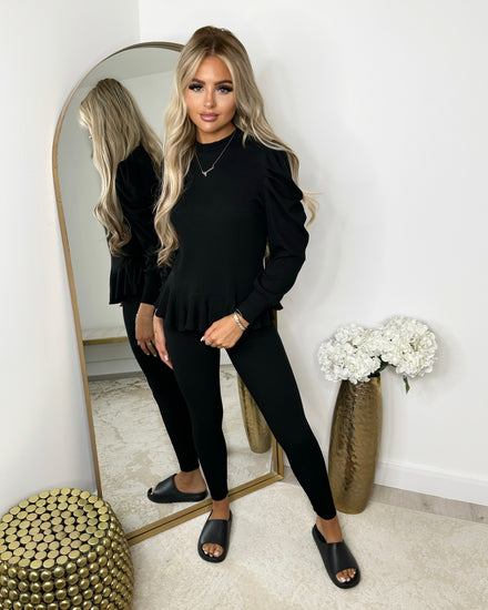 Carly Ribbed Puff Sleeve Lounge Set - Black