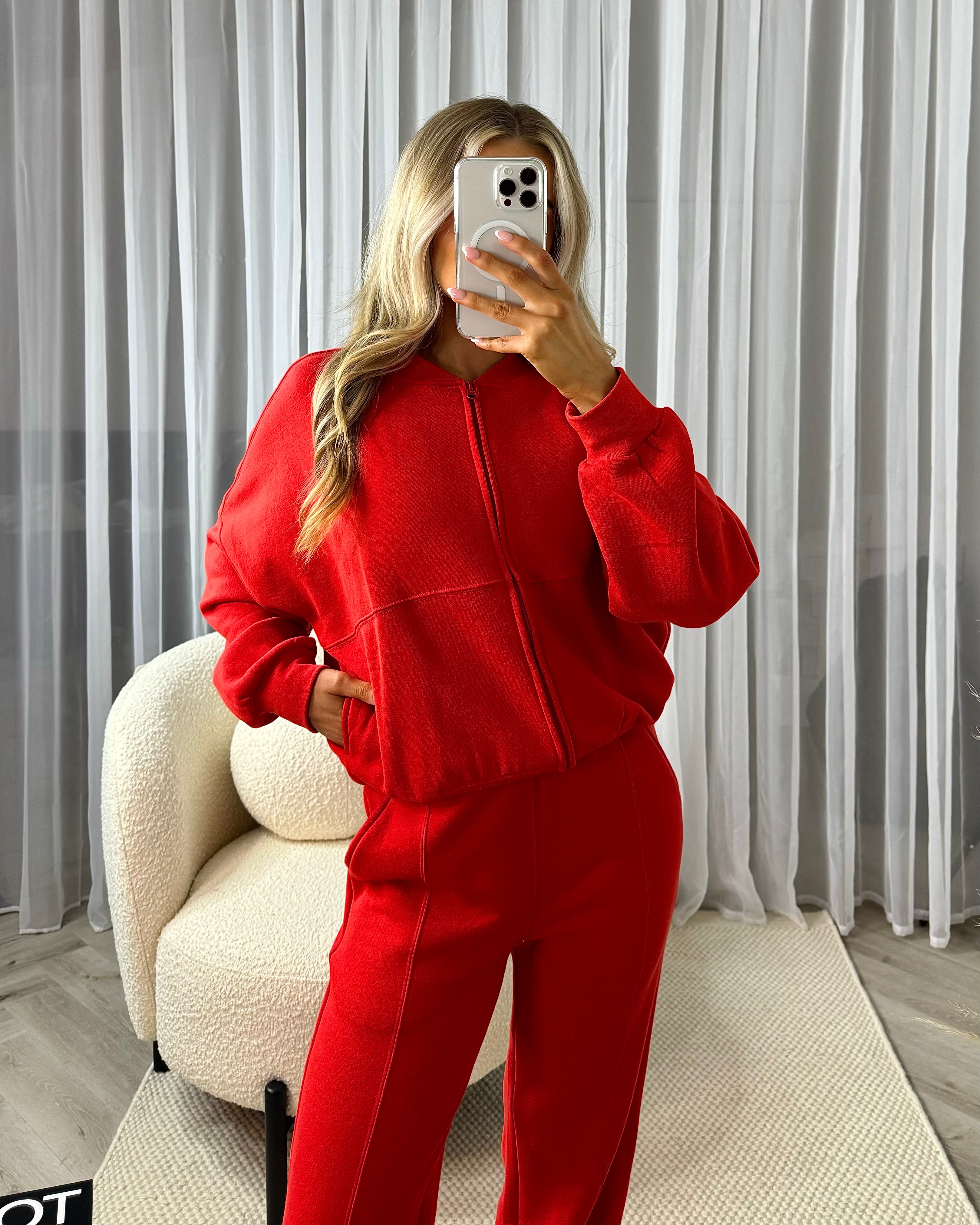 Amelia Bomber Zip Jacket & Straight Leg Joggers Set- Red