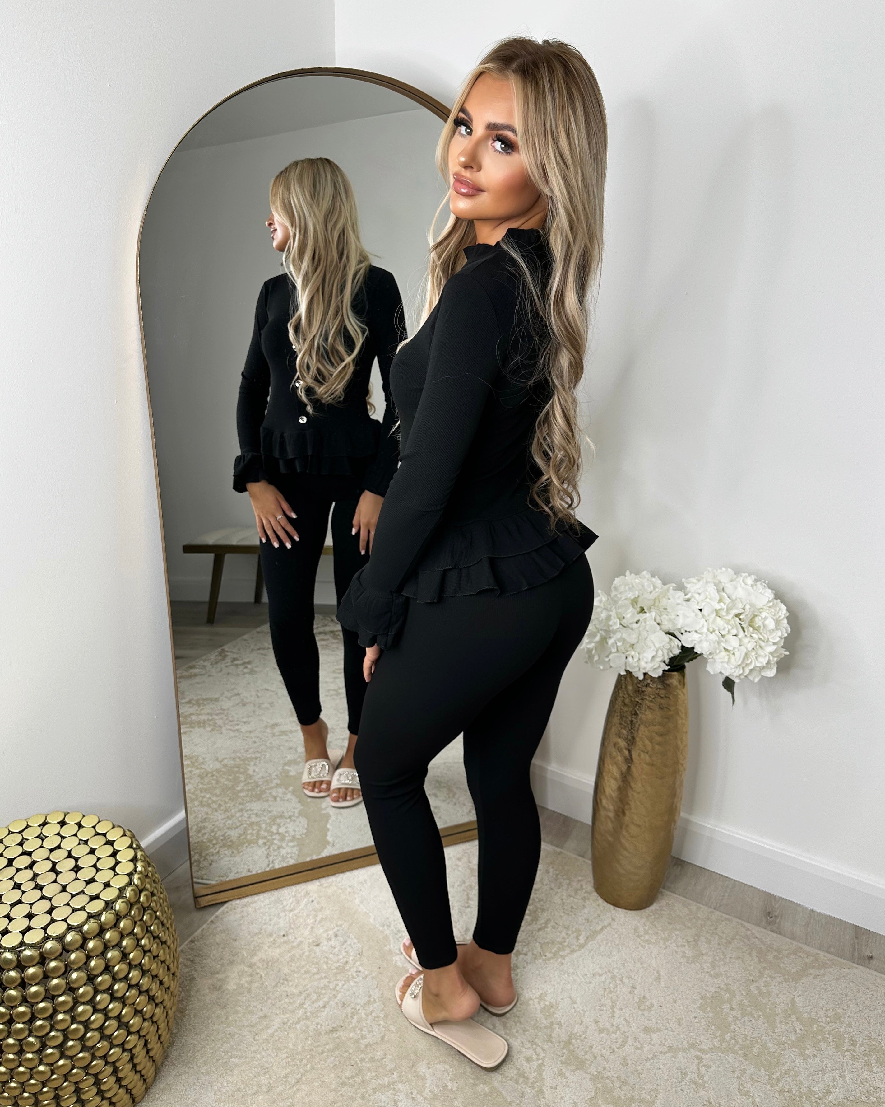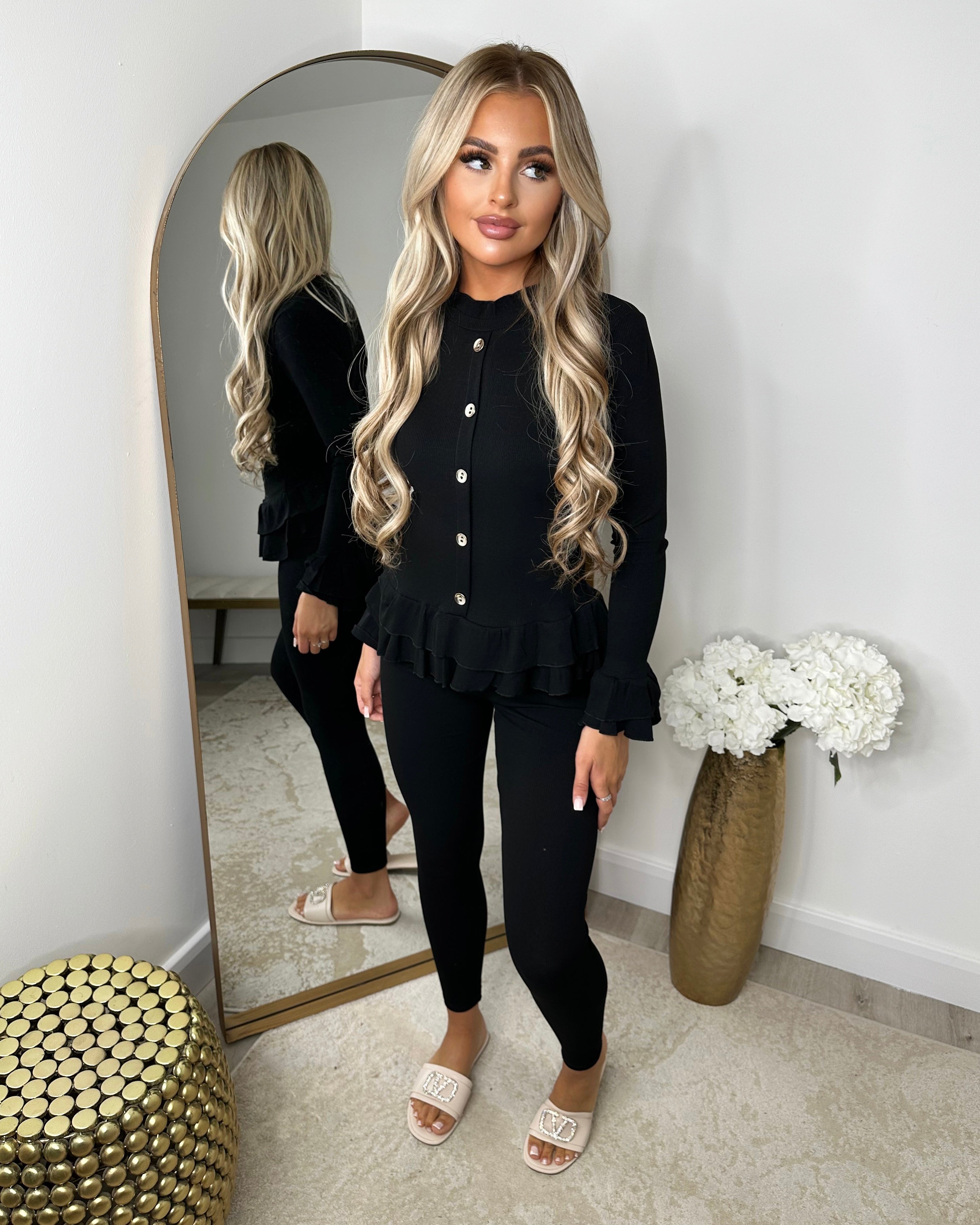 Amira Gold Button Ribbed Loungeset - Black