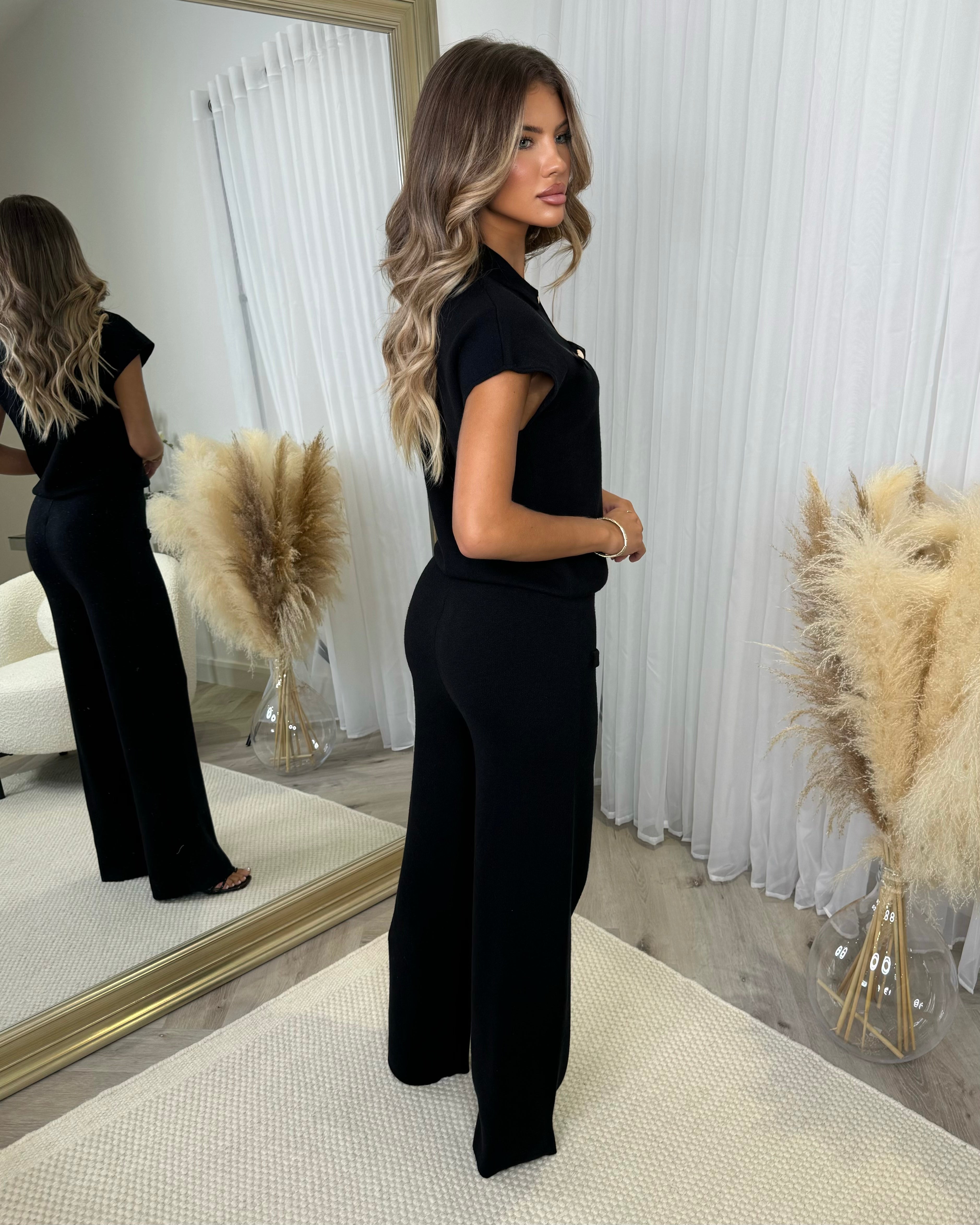 Angelina Short Sleeve Gold Button Jumper & Trouser Set - Black