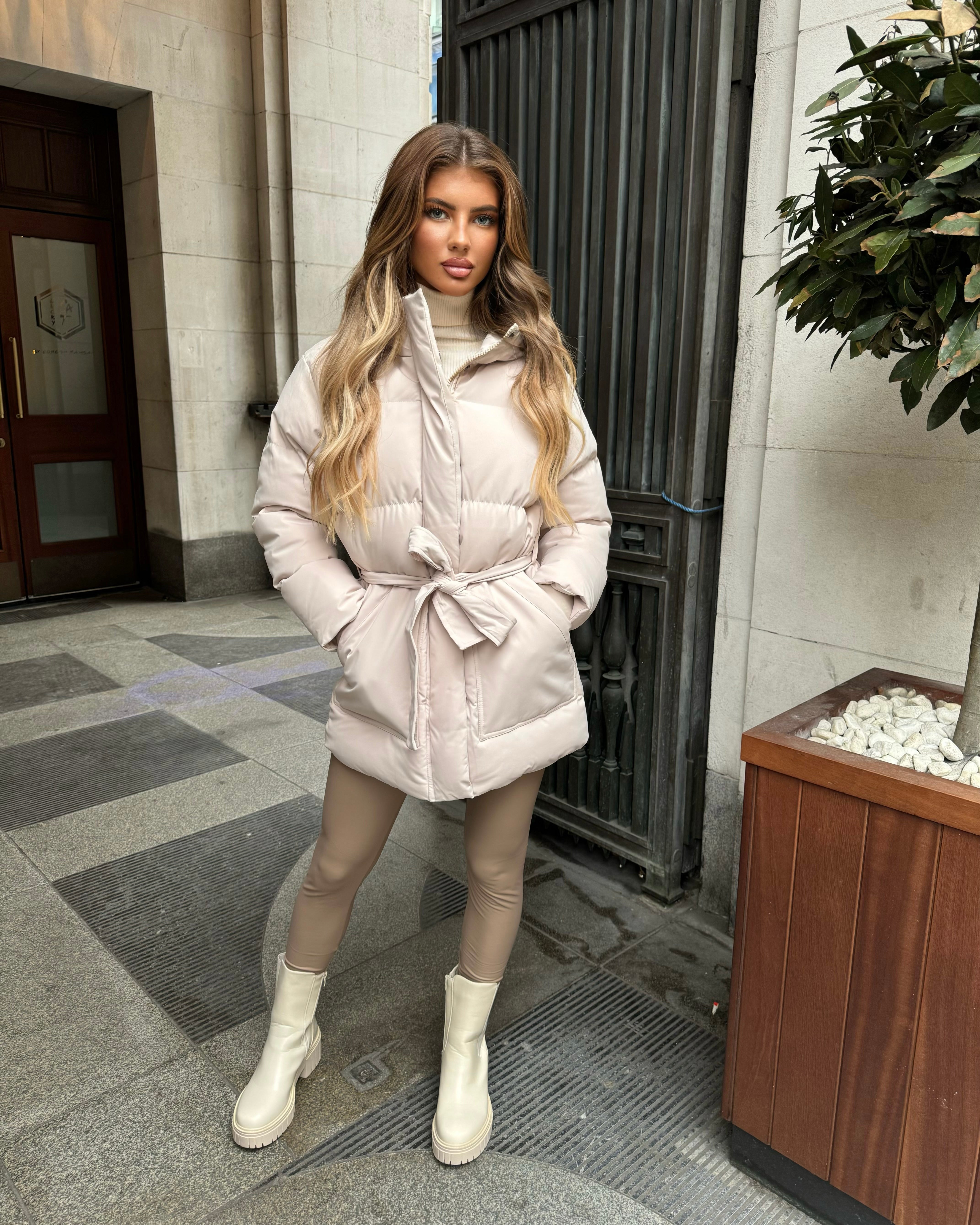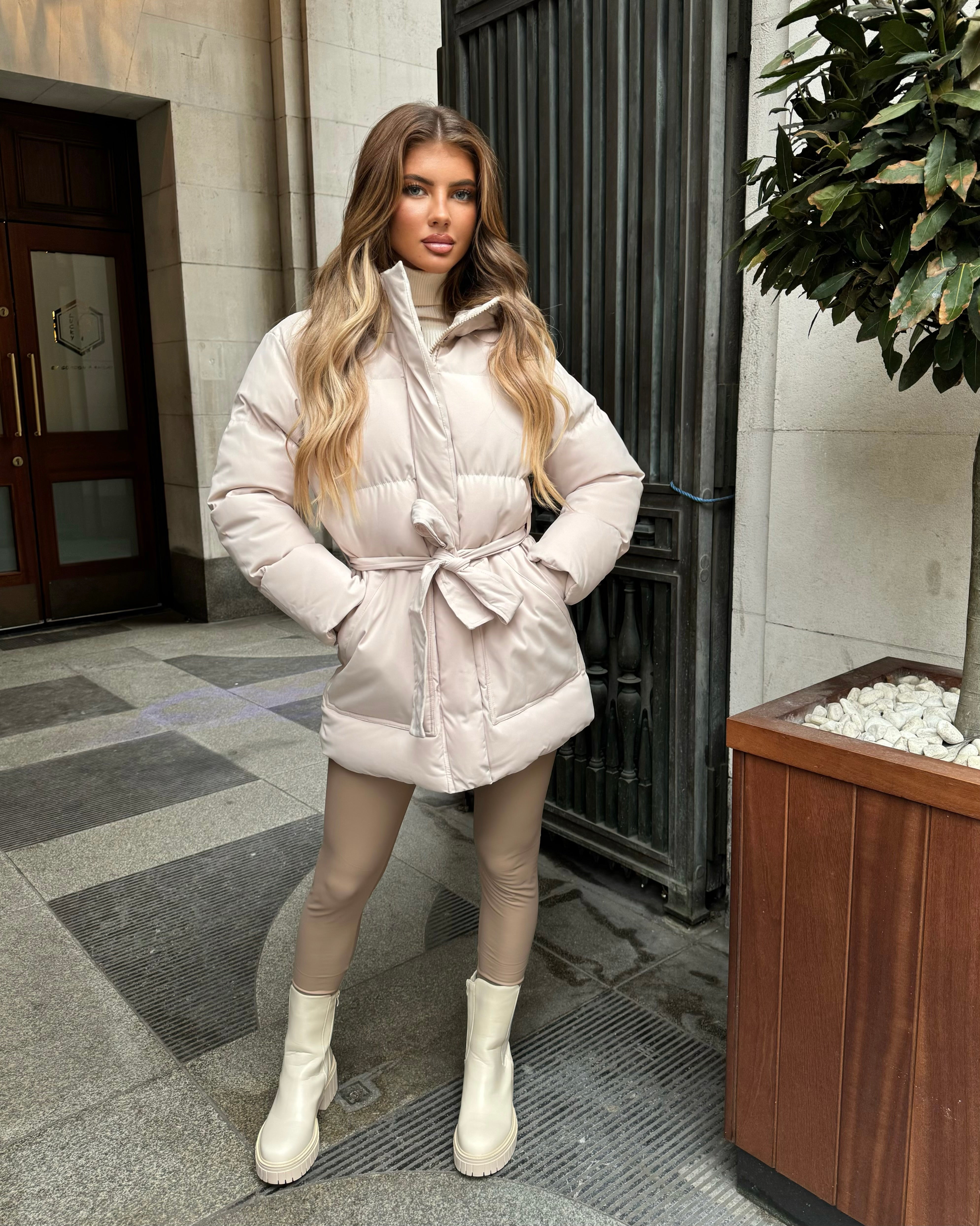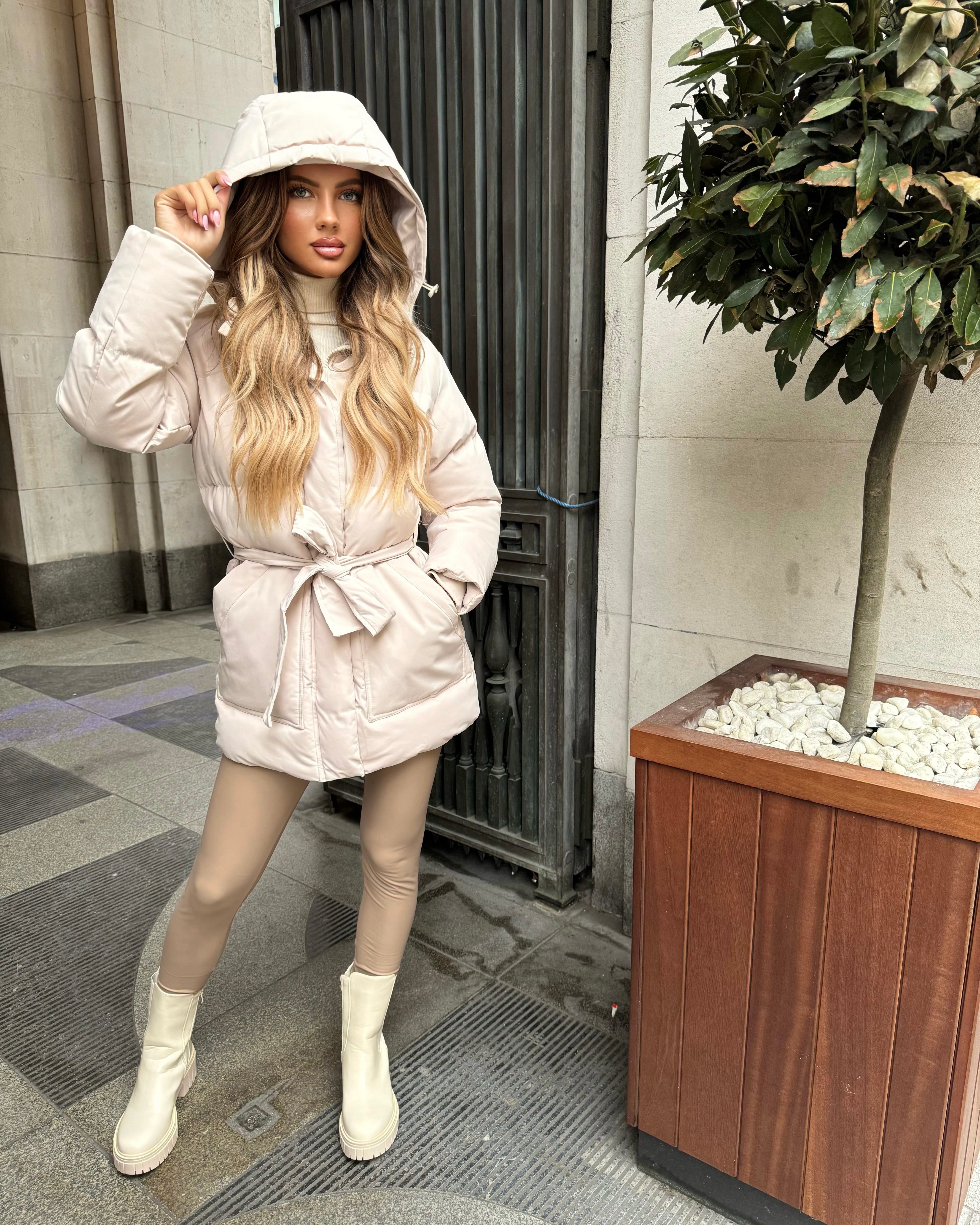 Arabella Hooded Short Padded Tie Waist Coat- Beige