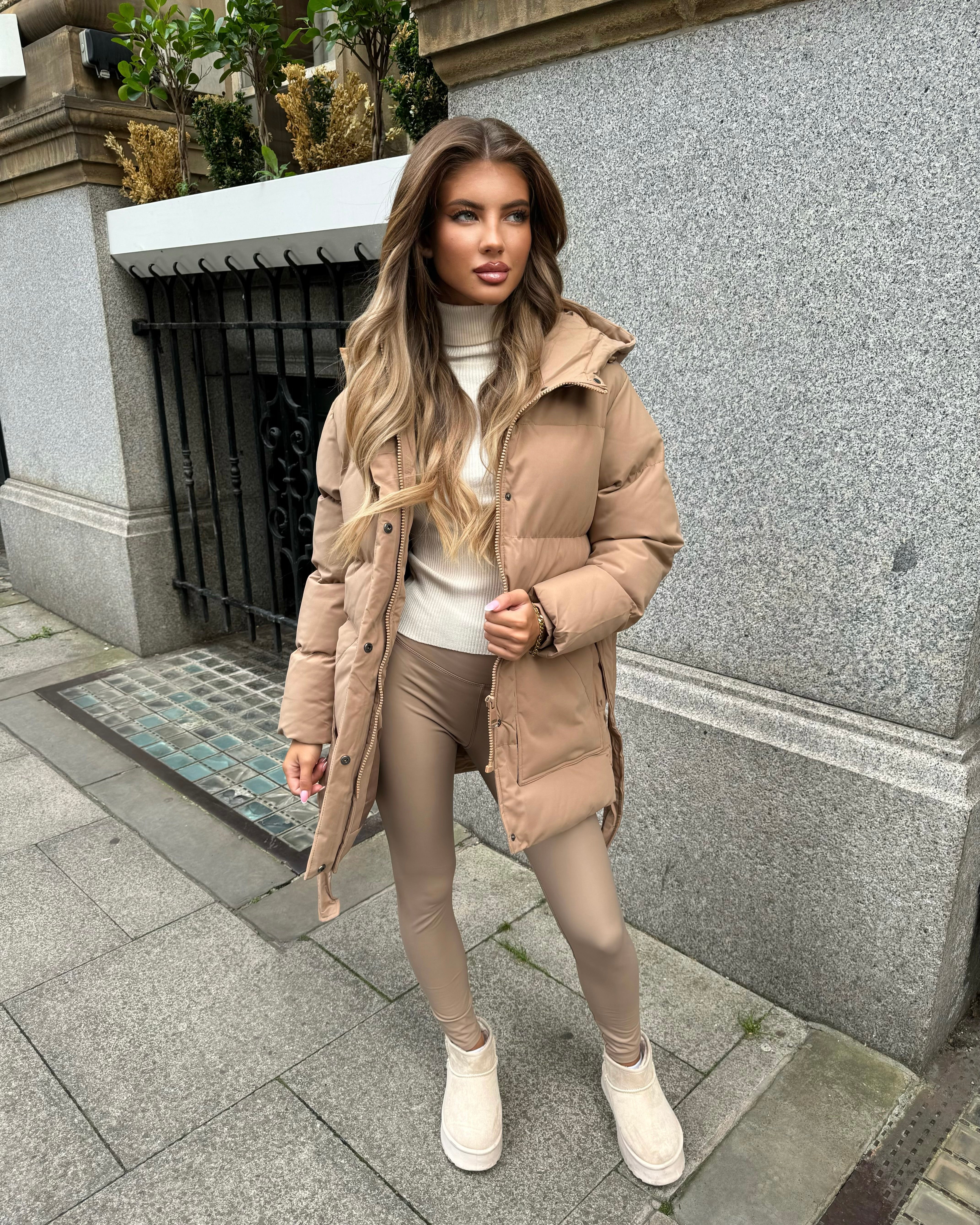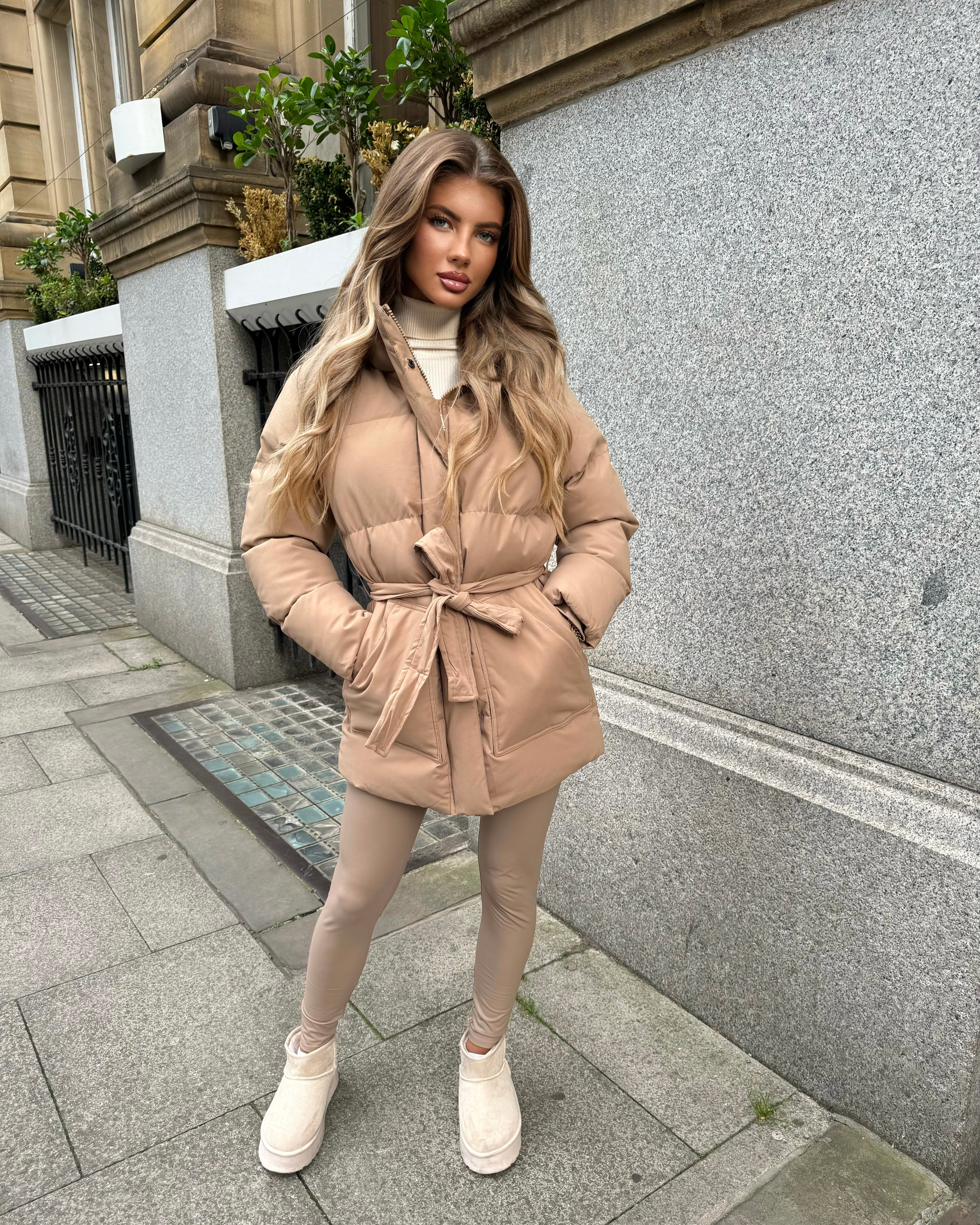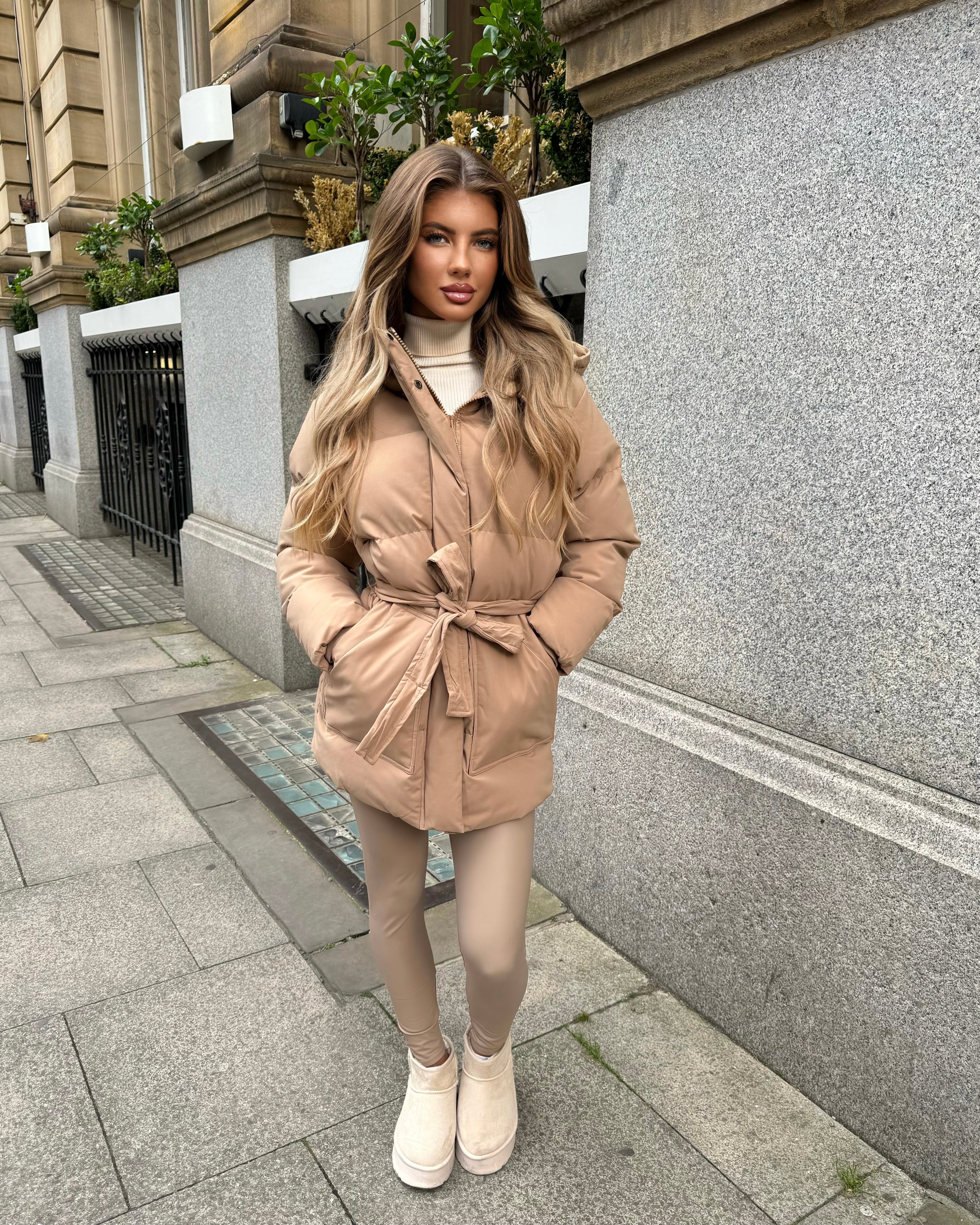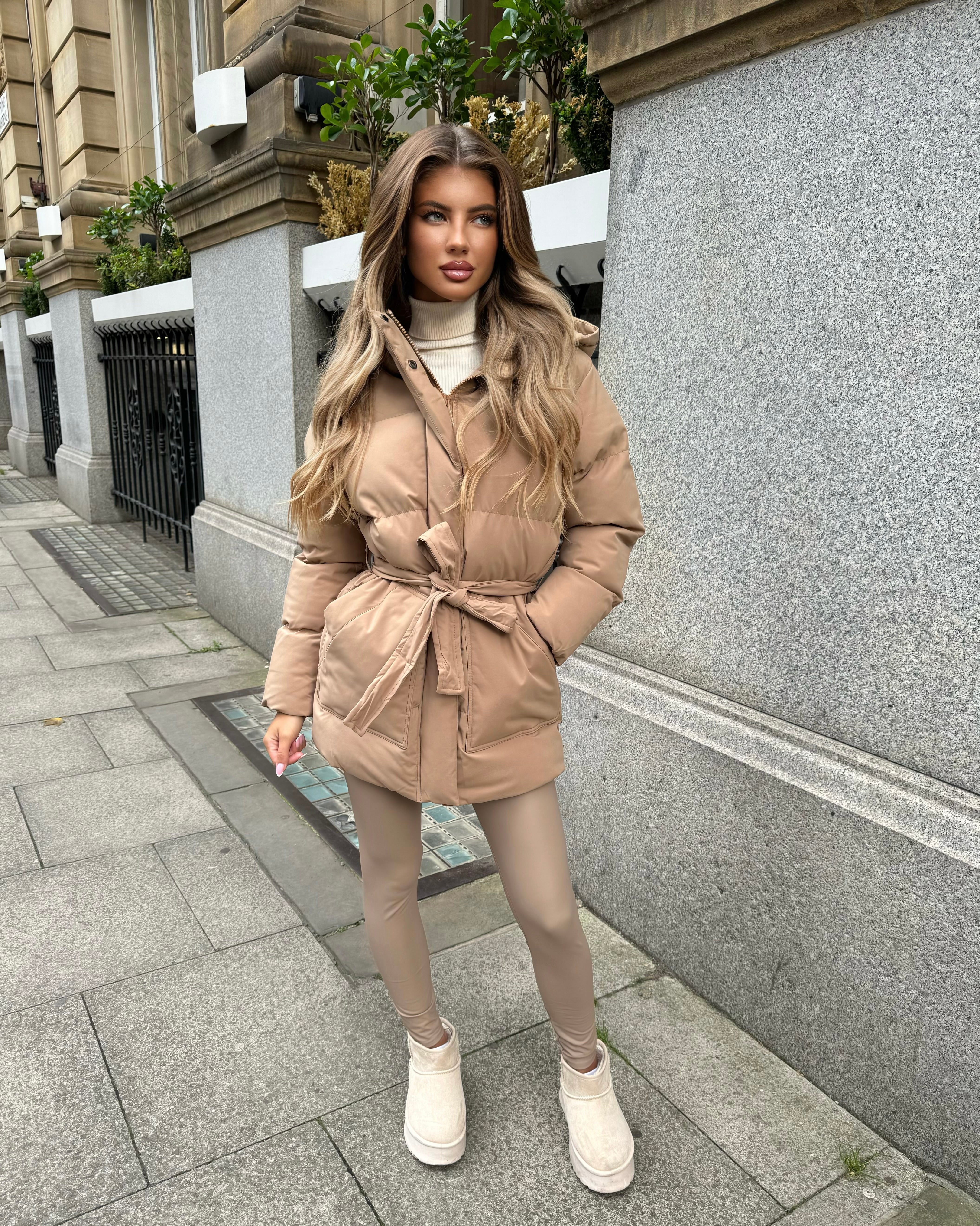 Arabella Hooded Short Padded Tie Waist Coat- Camel