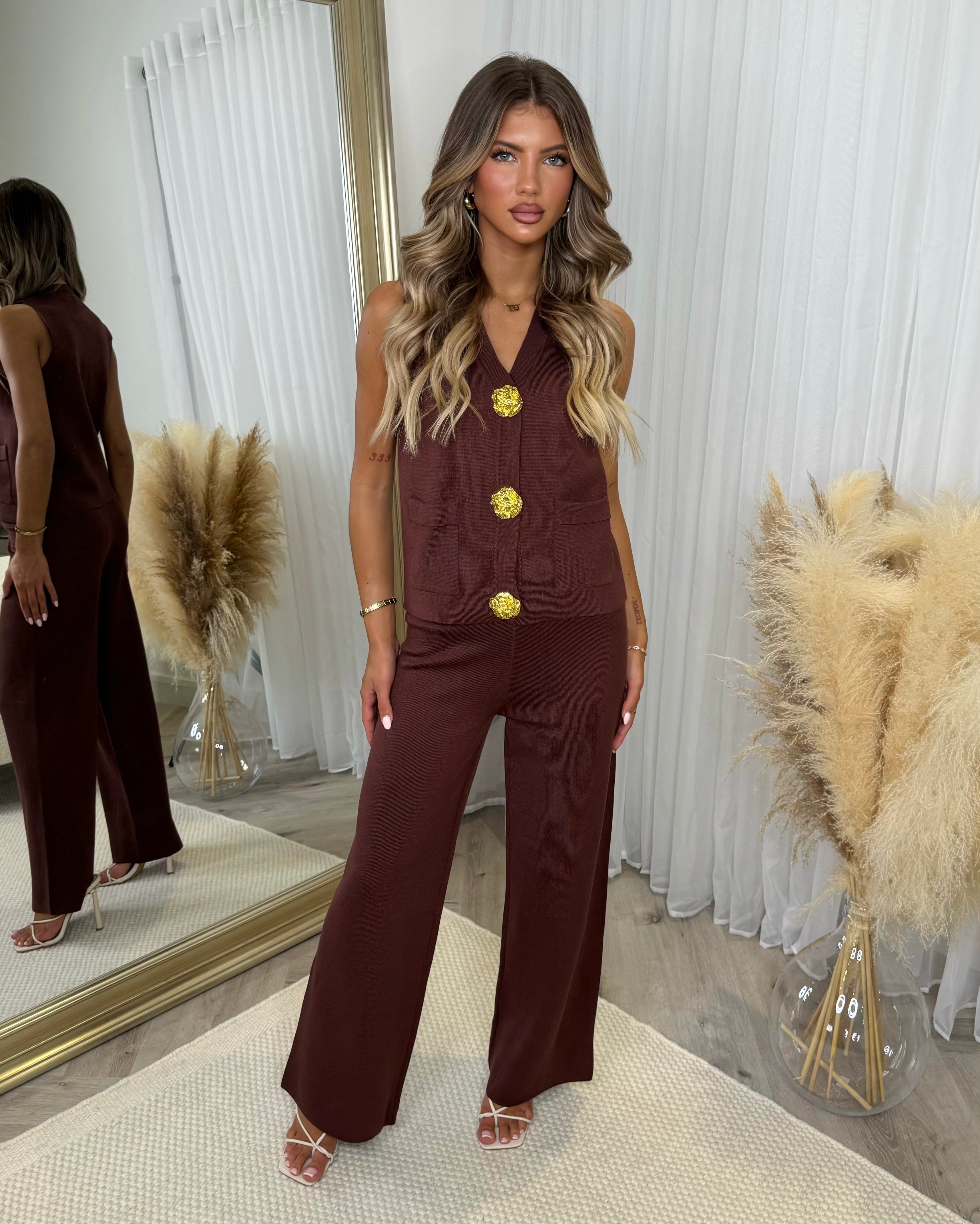 Diana Large Gold Button Detail Waistcoat & Straight Leg Trouser Set - Chocolate