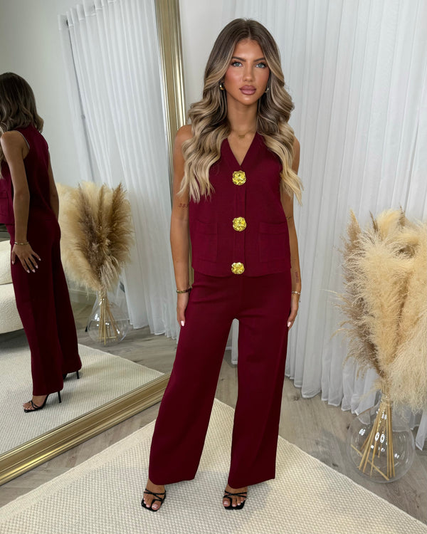 Diana Large Gold Button Detail Waistcoat & Straight Leg Trouser Set - Wine