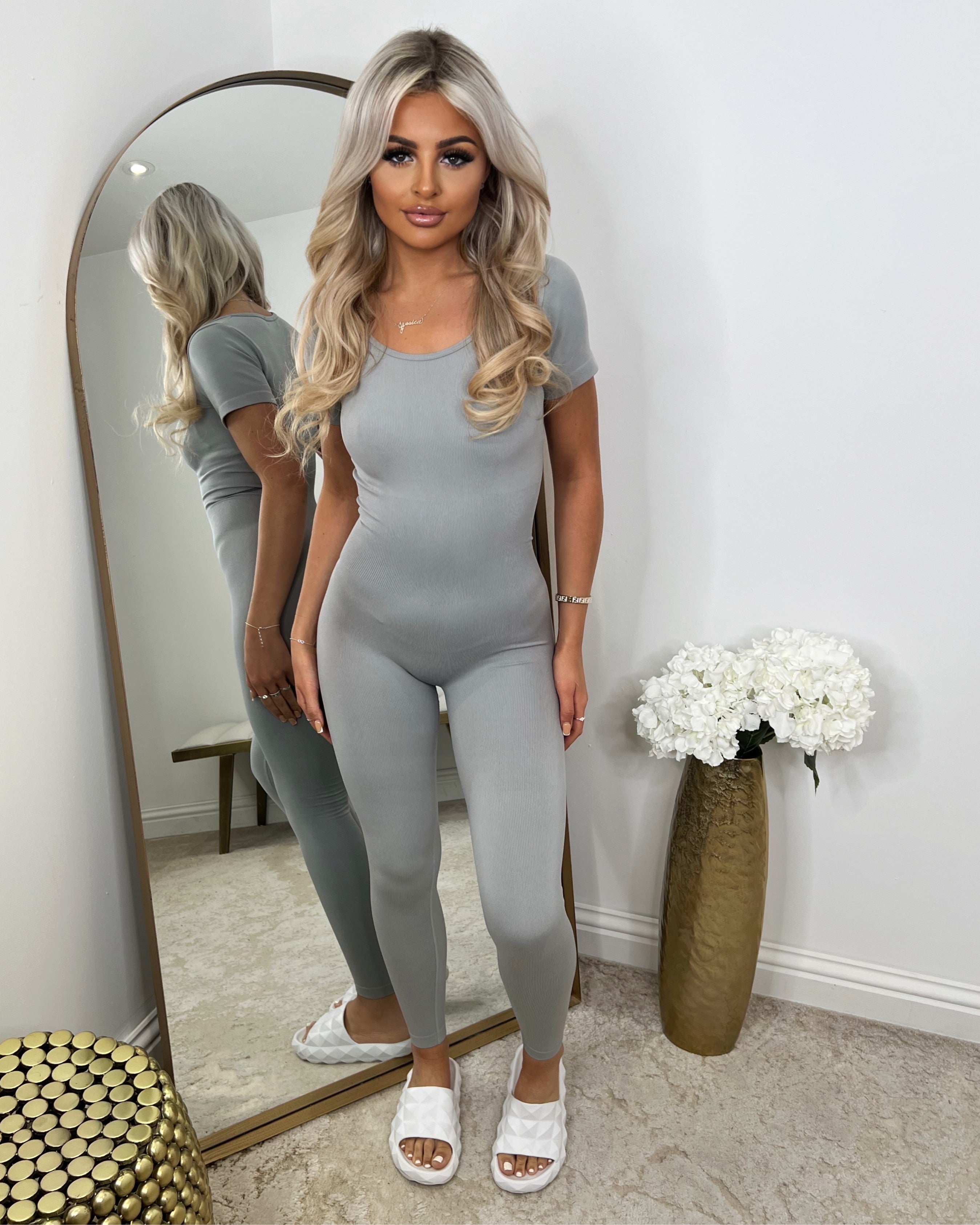 Ellie Capped Sleeve Unitard Jumpsuit - Light Grey