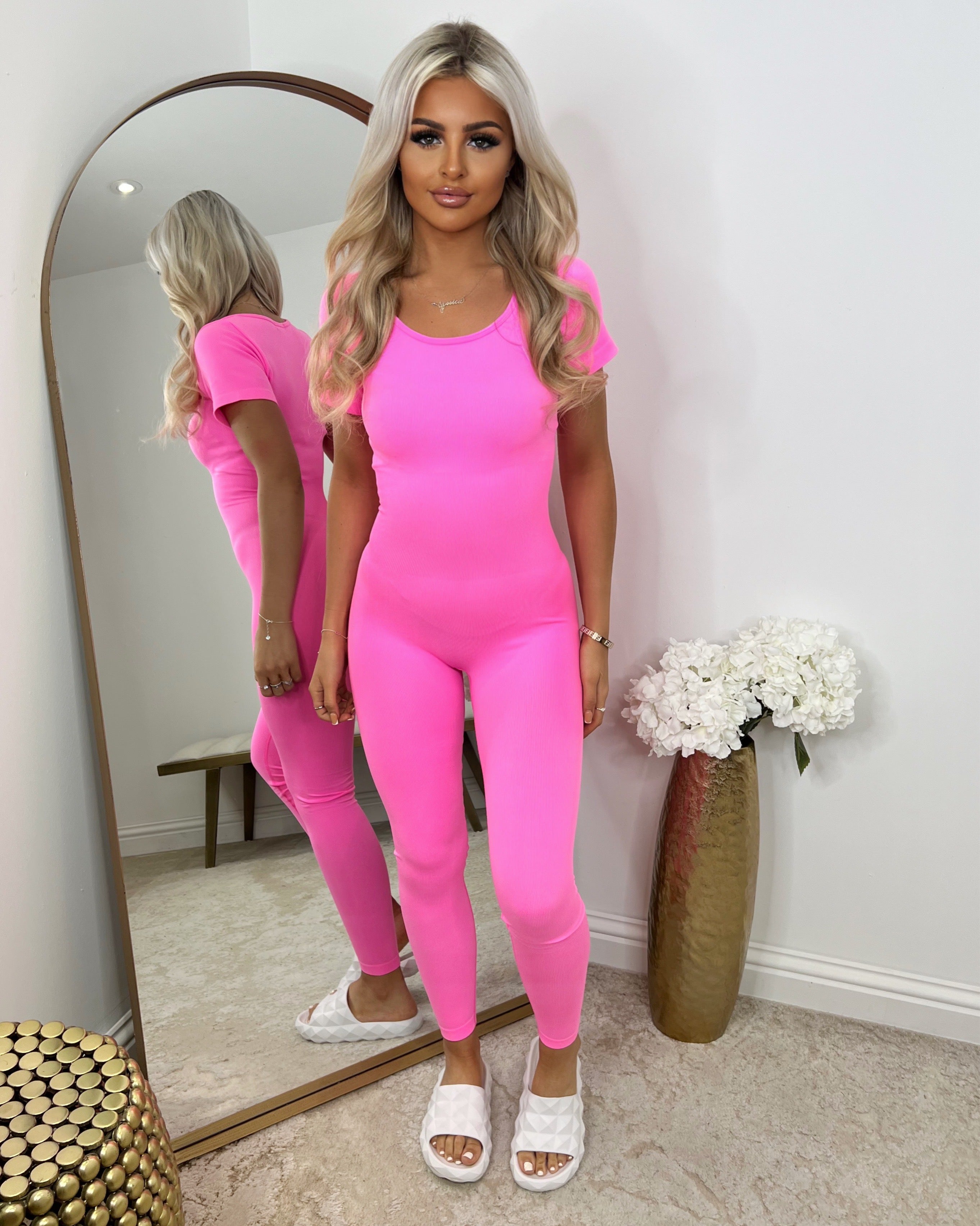 Ellie Capped Sleeve Unitard Jumpsuit - Neon Pink