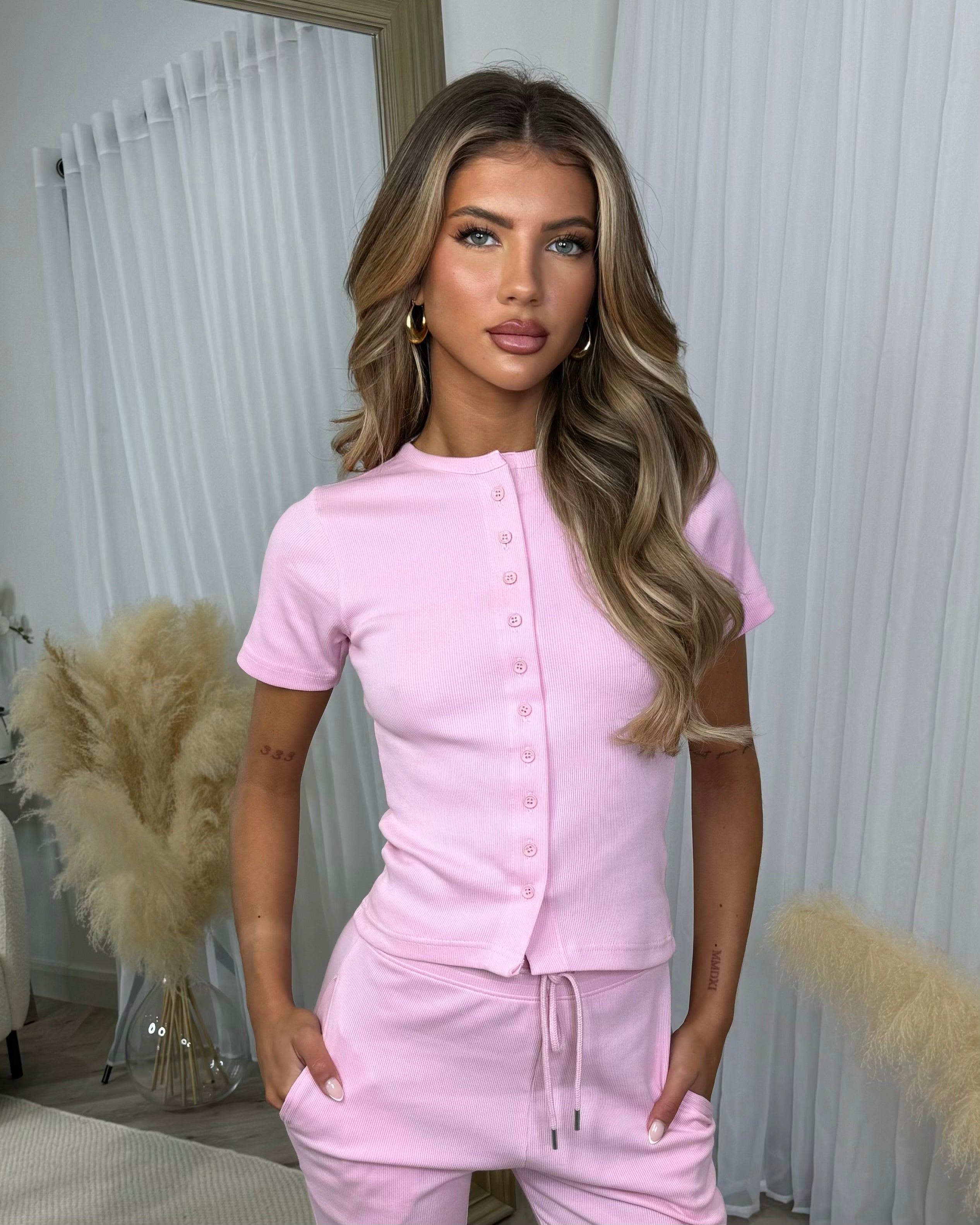 Elsie Short Sleeve Button Top & Trouser Co-ord Set - Baby Pink