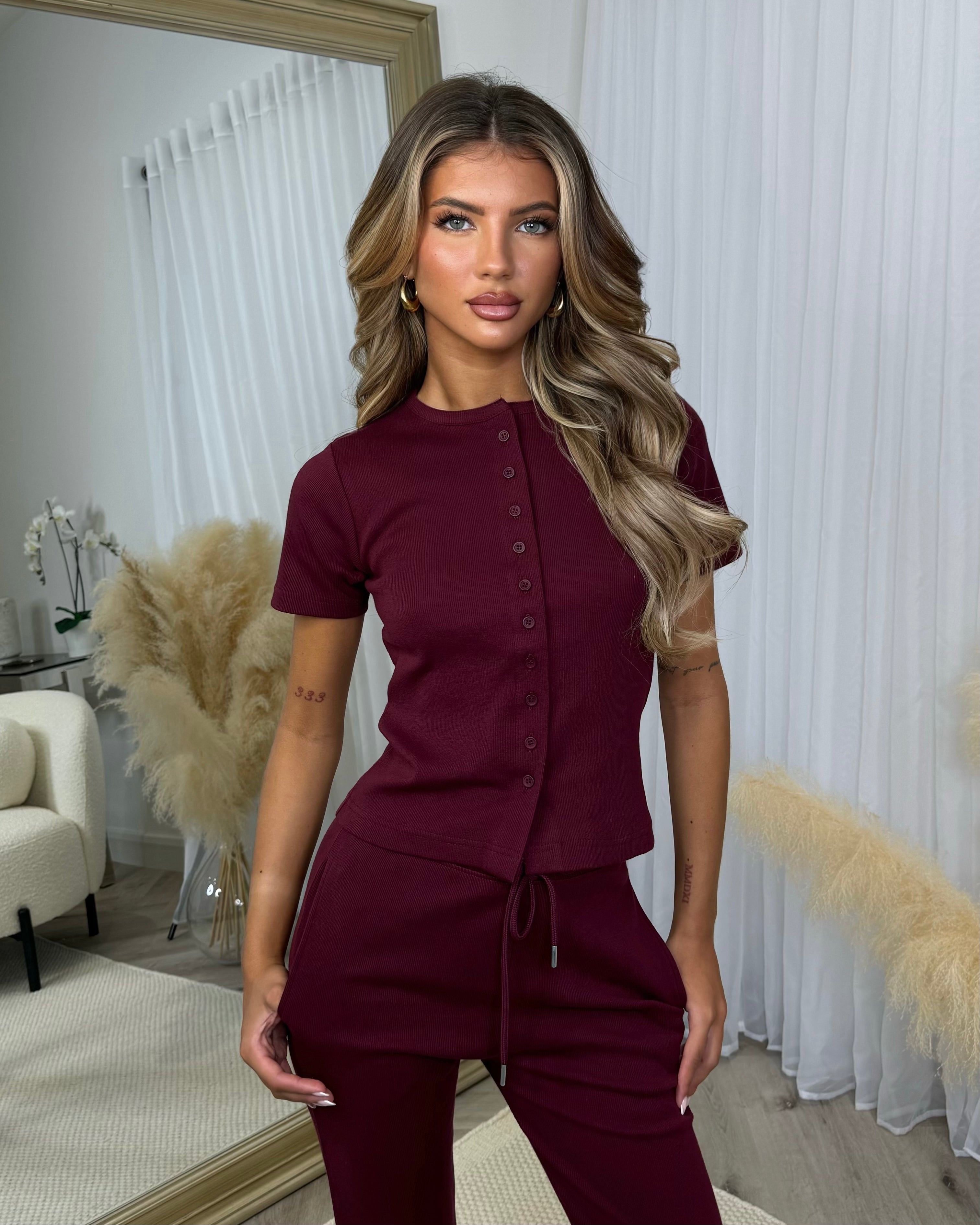 Elsie Short Sleeve Button Top & Trouser Co-ord Set - Wine