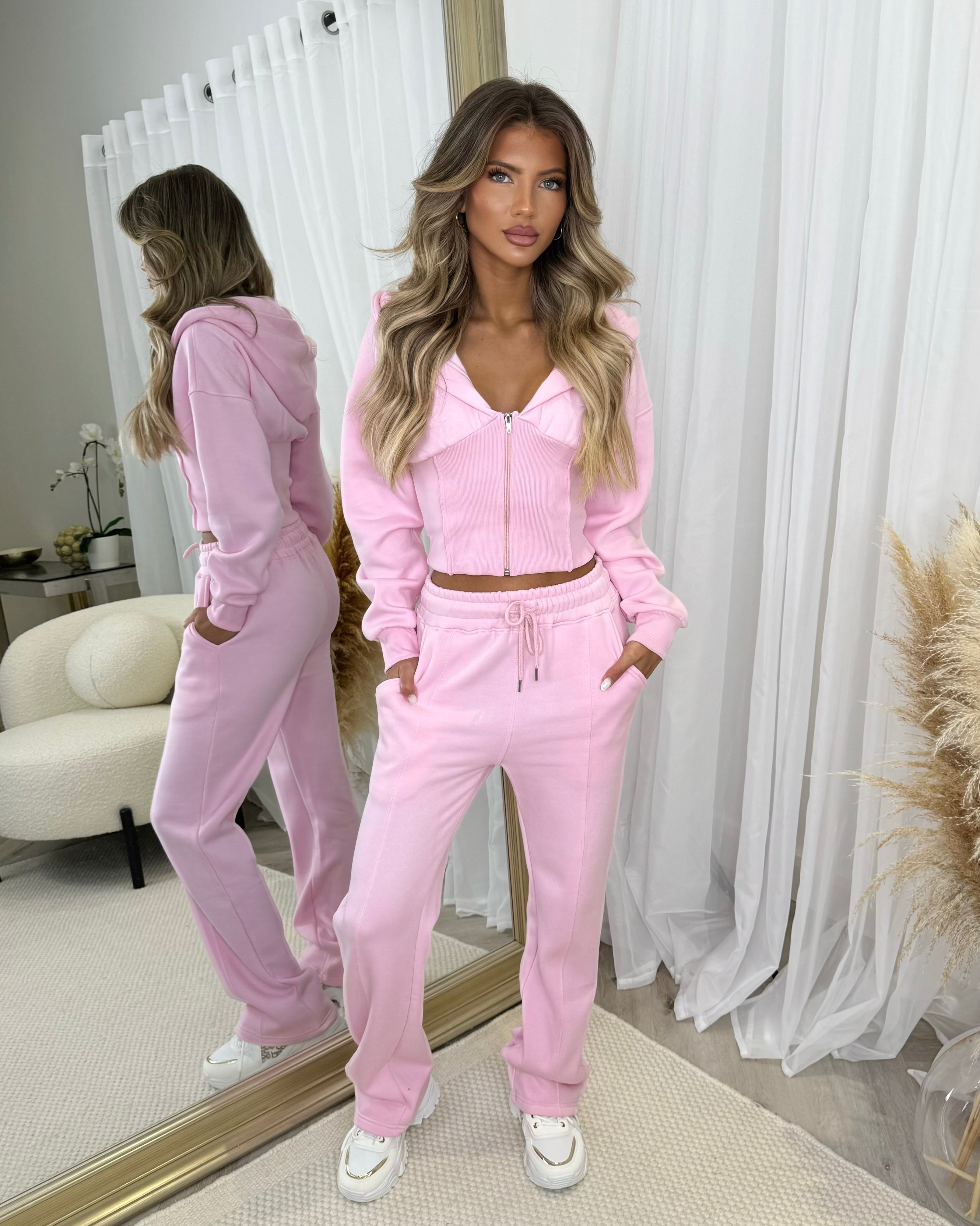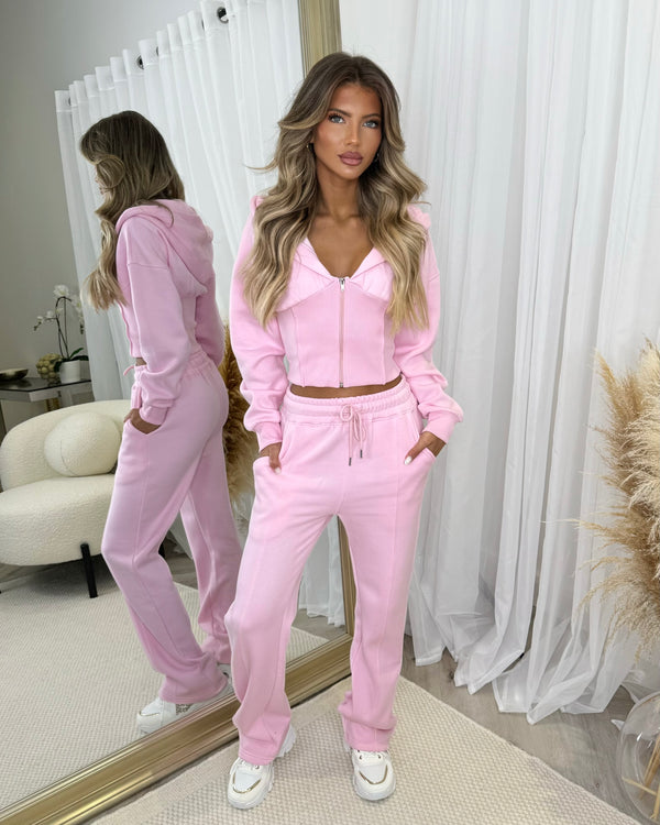 Hayley Corset Design Hooded Zip Jacket with Straight Leg Trousers Set - Baby Pink