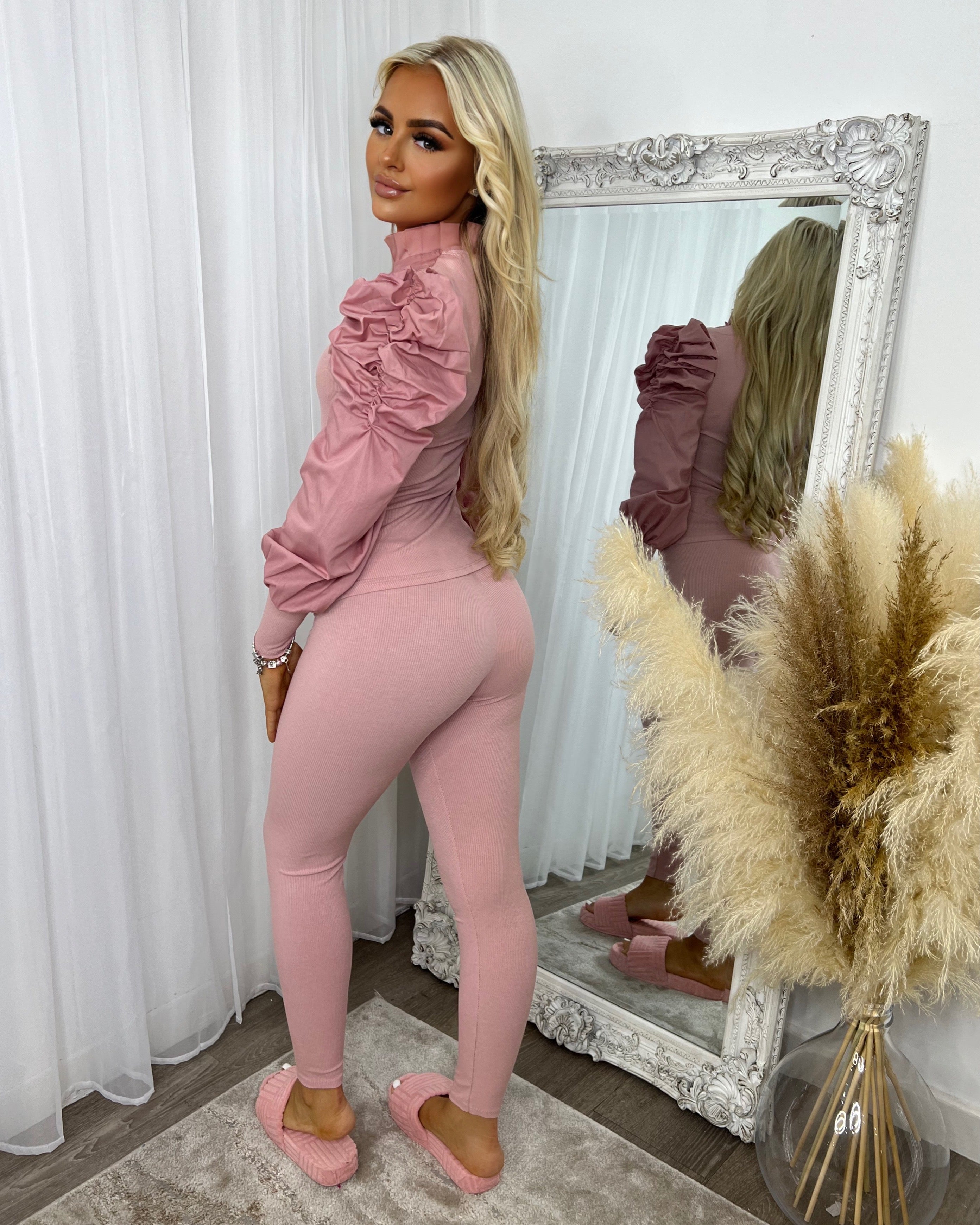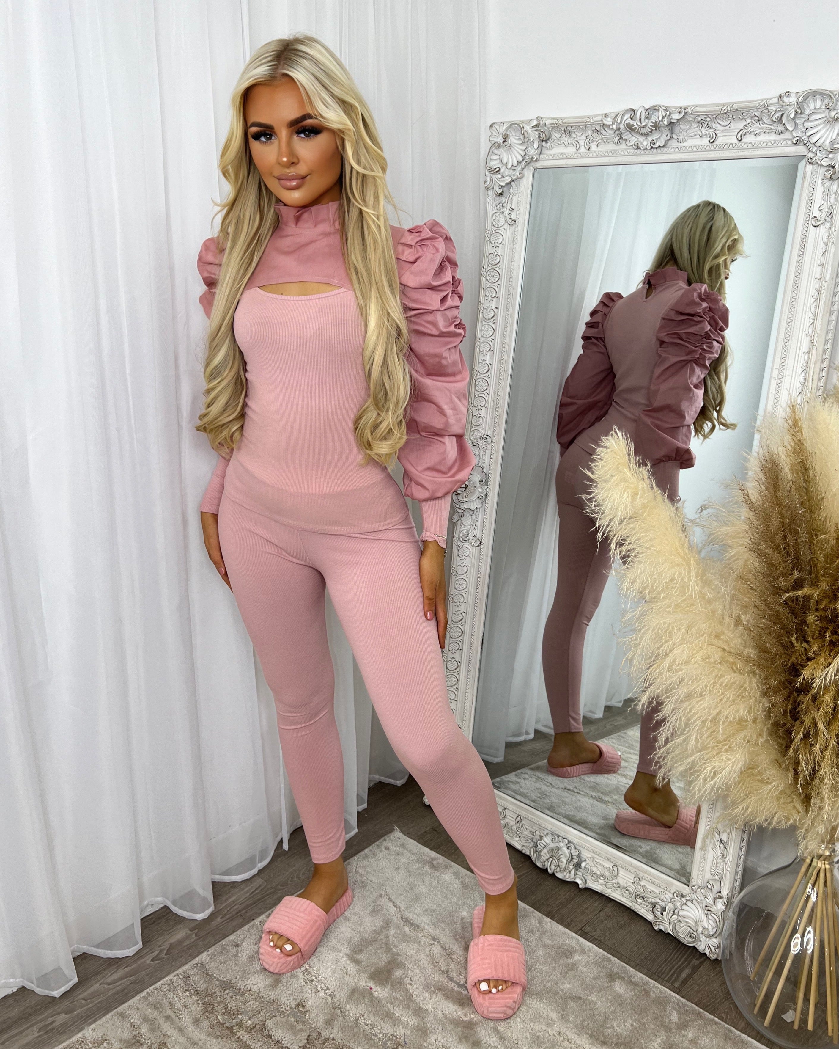 Hazel Slit Front Puff Sleeve Loungewear Set - Pink