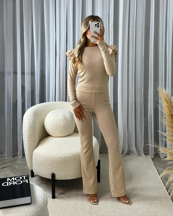 Hollie Ribbed Round Neck Frill Sleeve Detail Top & Trouser Set - Beige