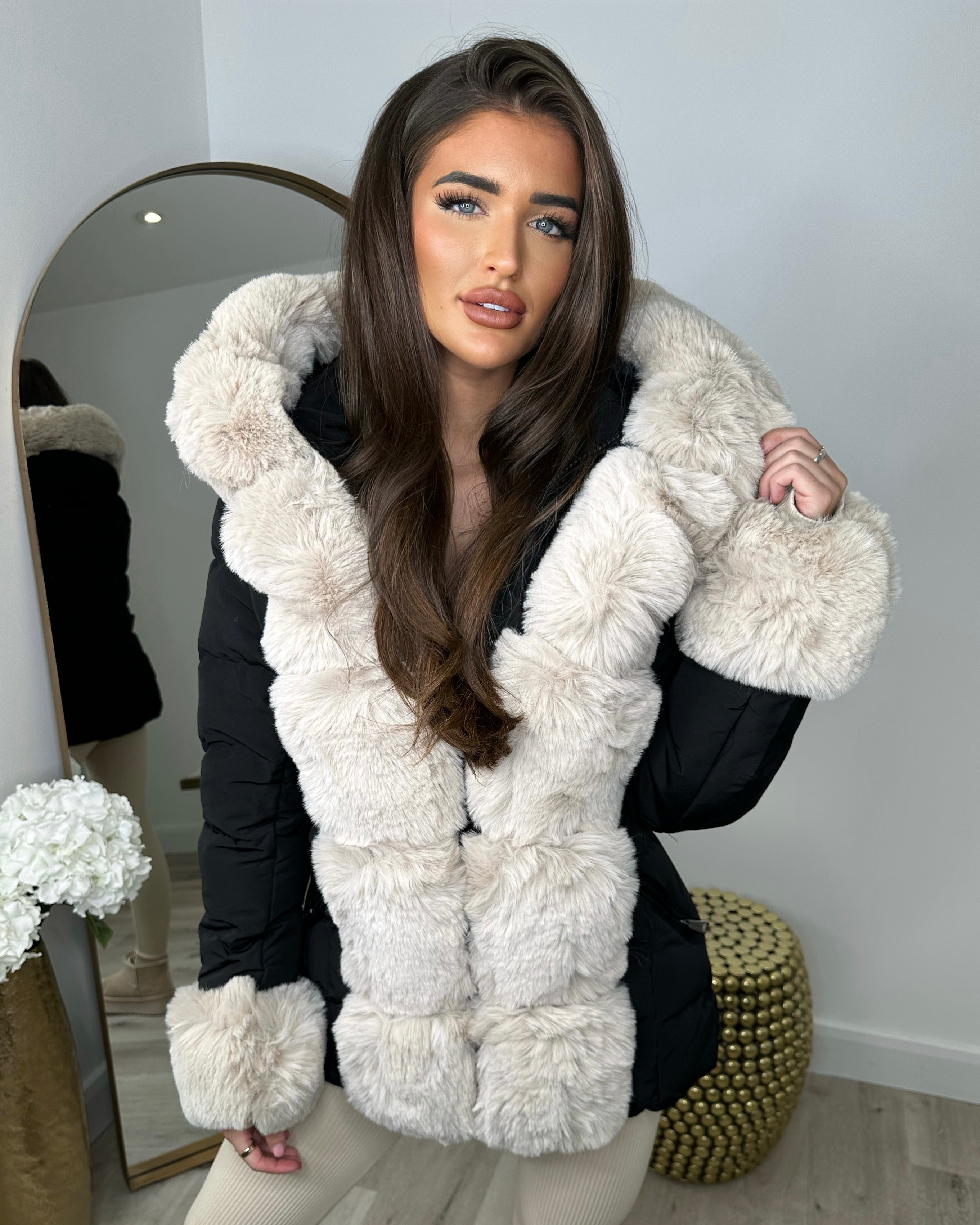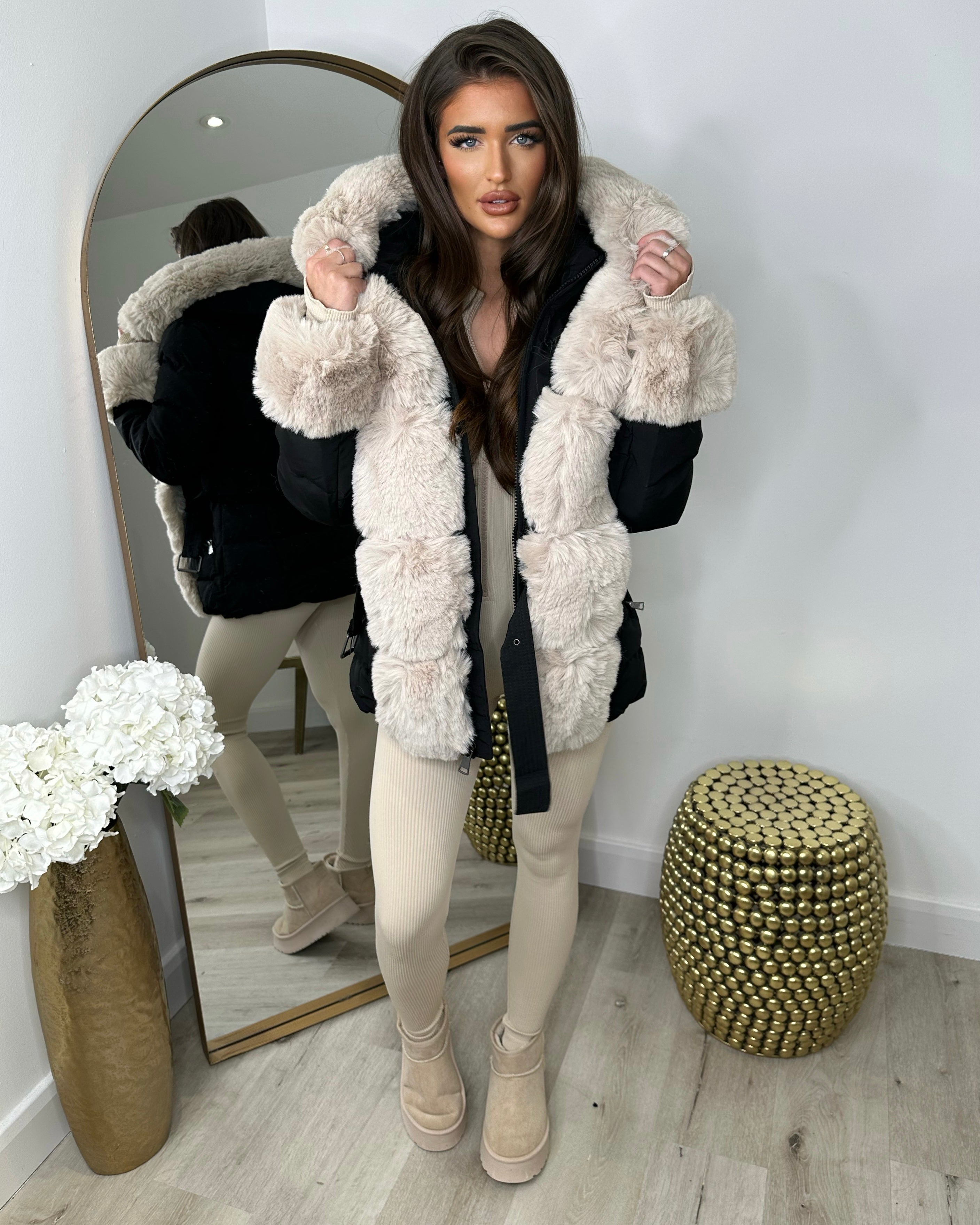 Isobella Belted Faux Fur Trim Hooded Coat - Black/Cream