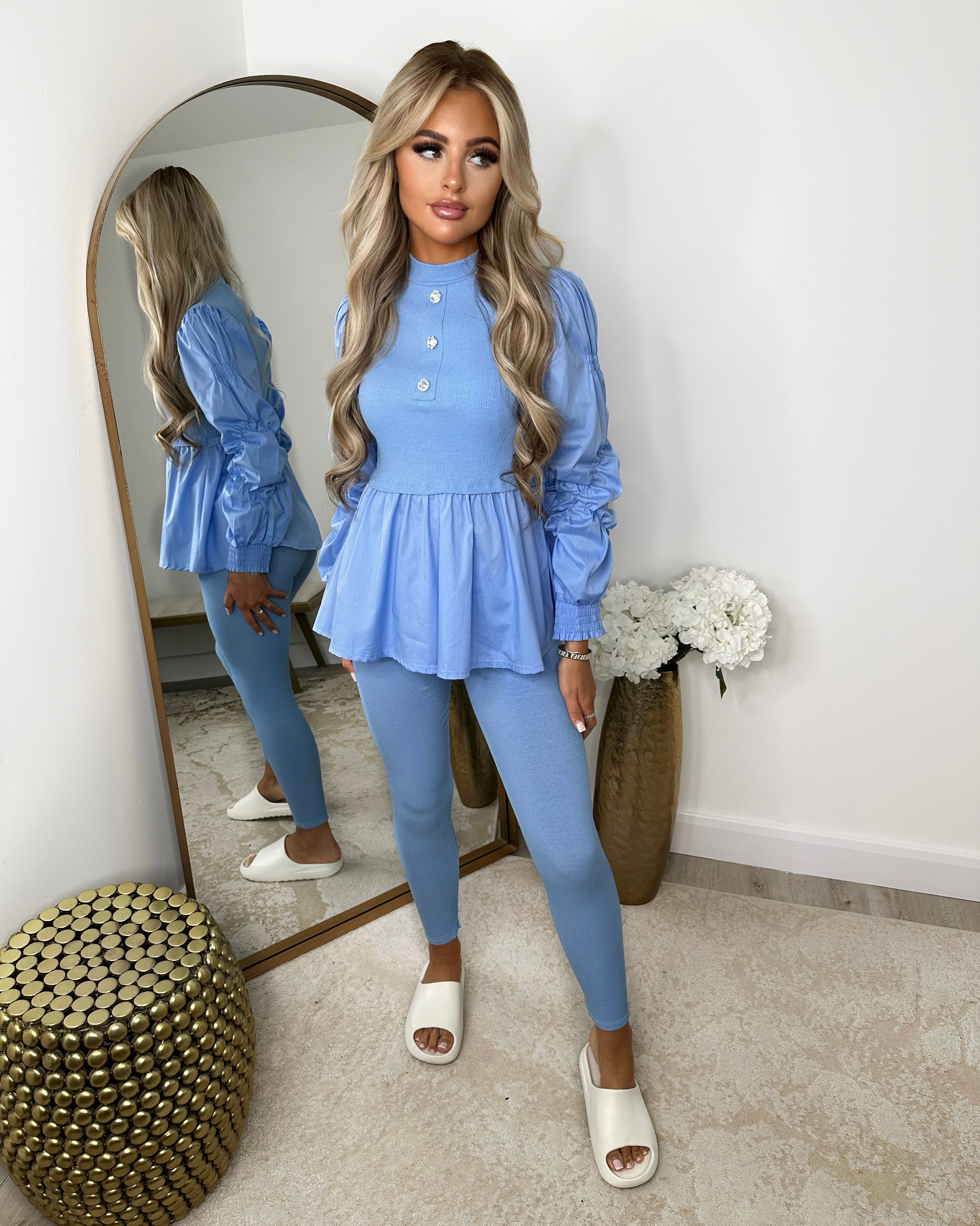 Kerri Ribbed Jewelled Detail Lounge Set - Baby Blue