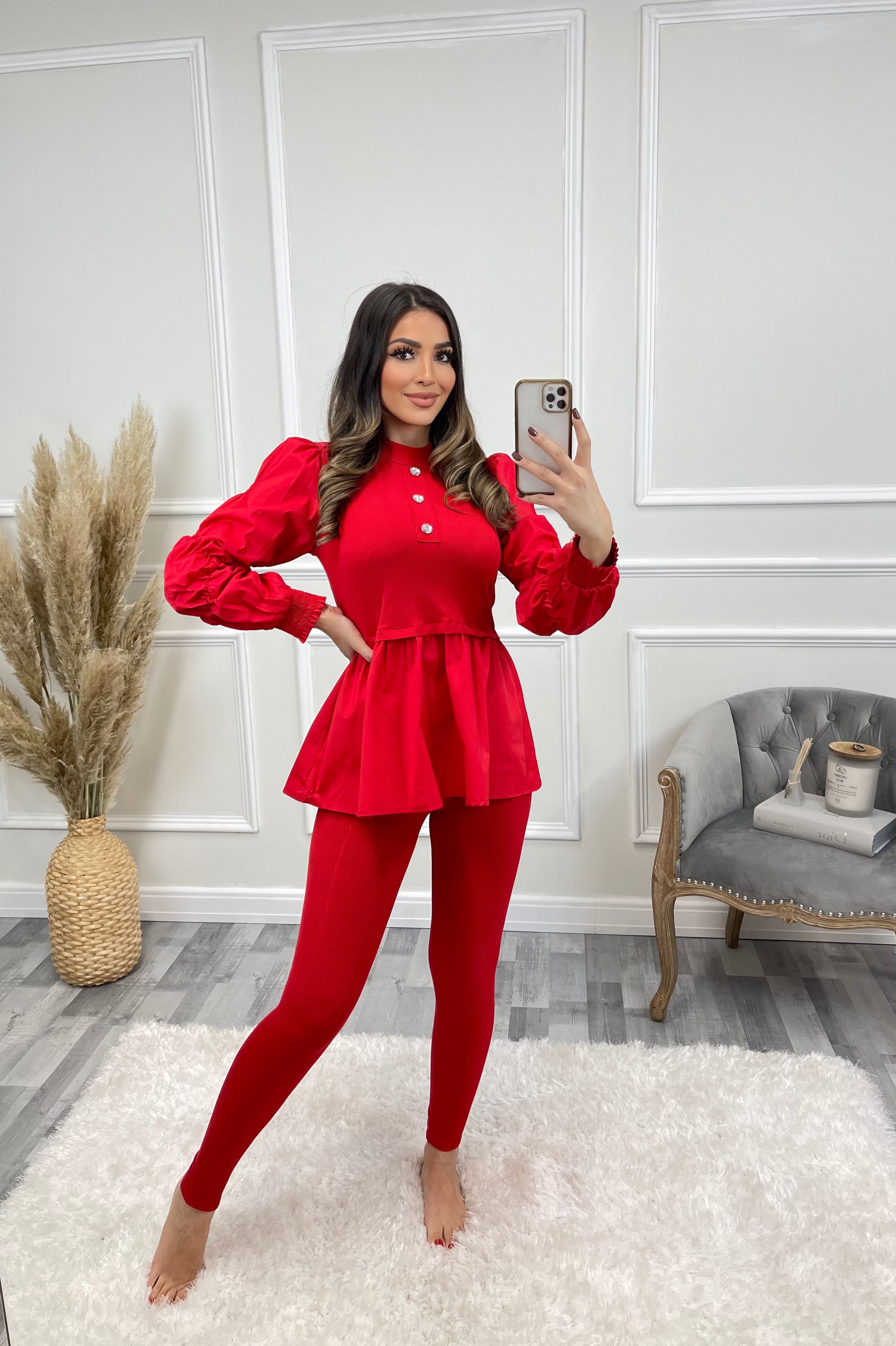 Kerri Ribbed Jewelled Detail Lounge Set - Red