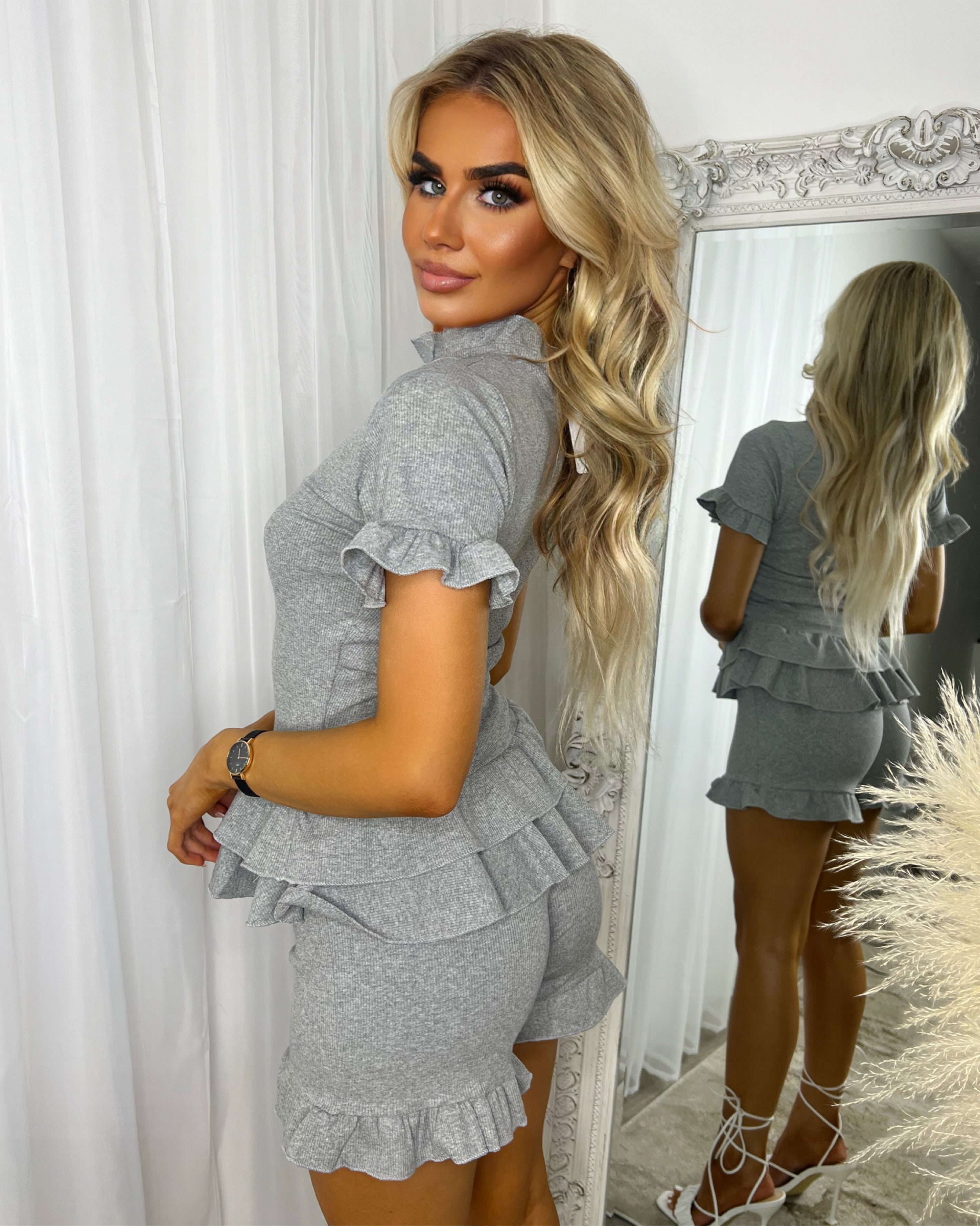 Levi Short Sleeve Jewelled Button Short Set - Grey