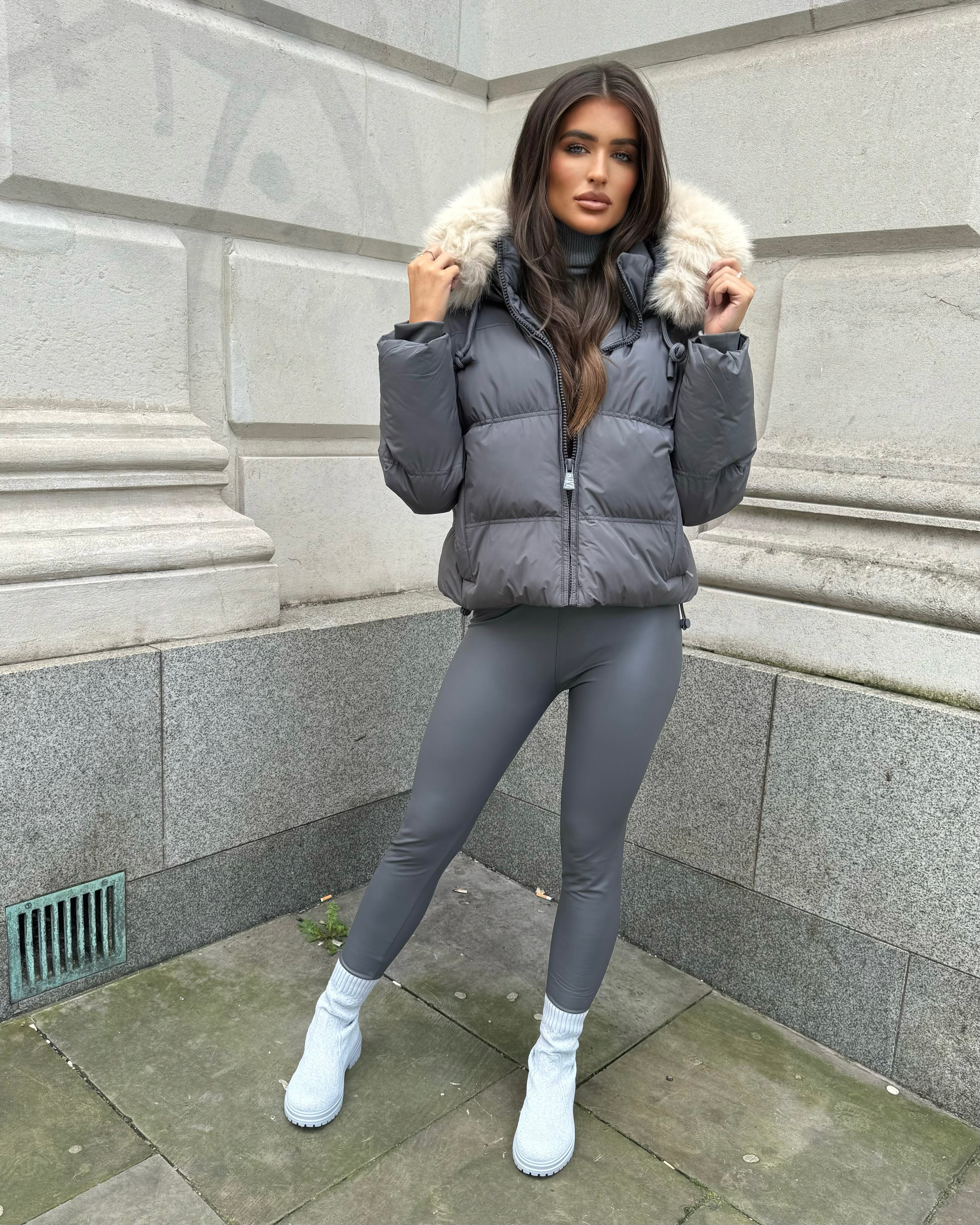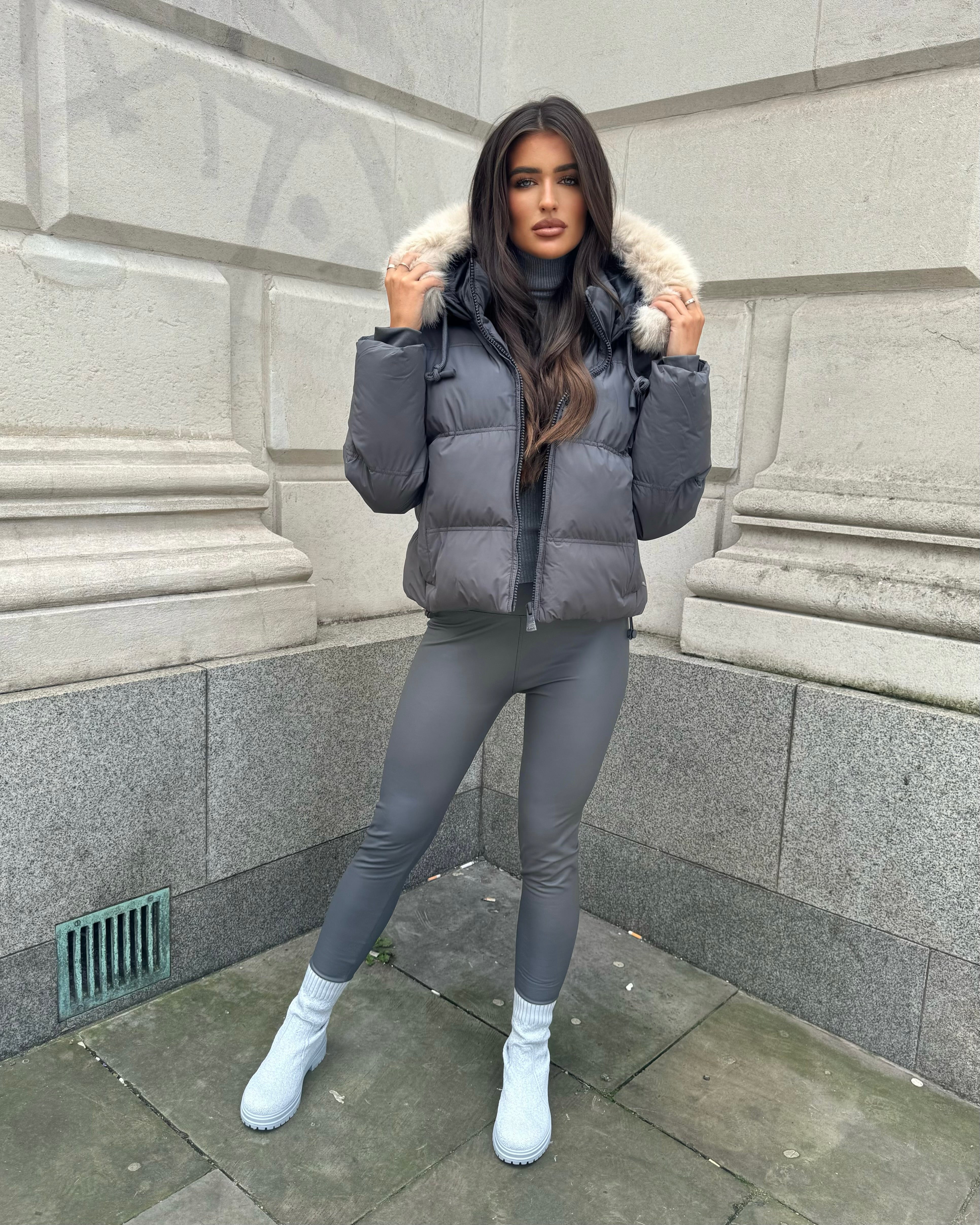 Lucinda Short Padded Faux Fur Trim Coat- Grey