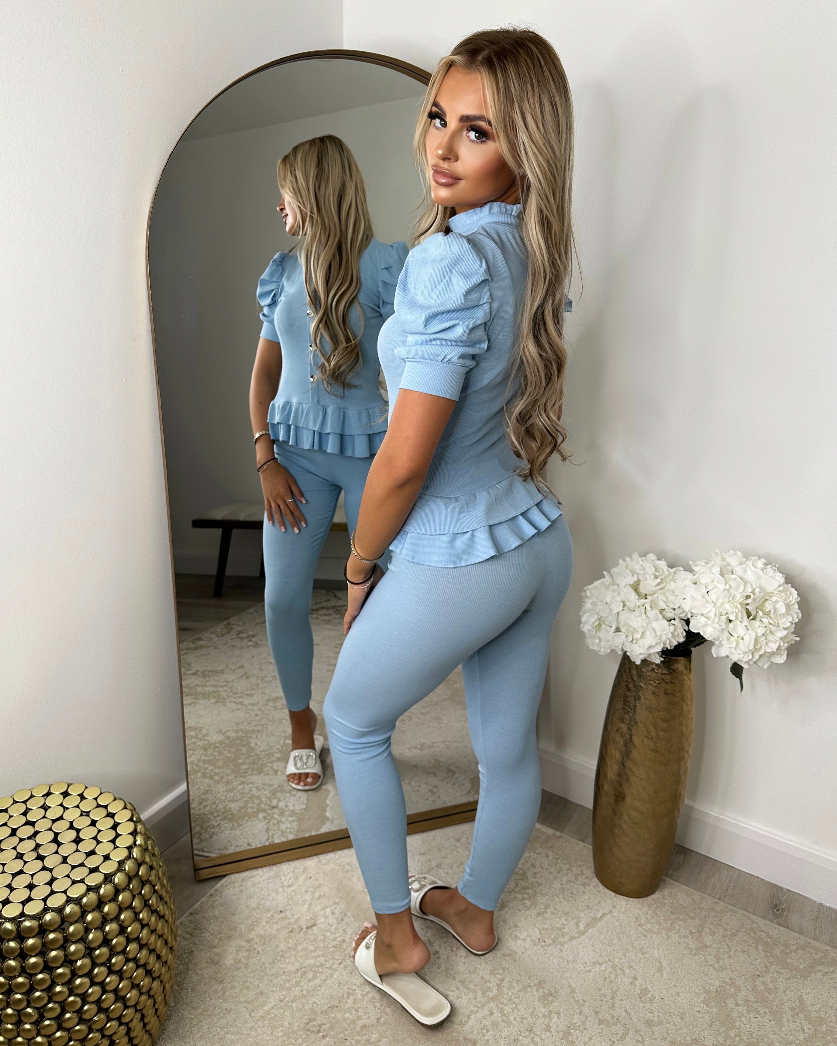 Piper Gold Button Short Sleeve Ribbed Loungeset - Sky Blue