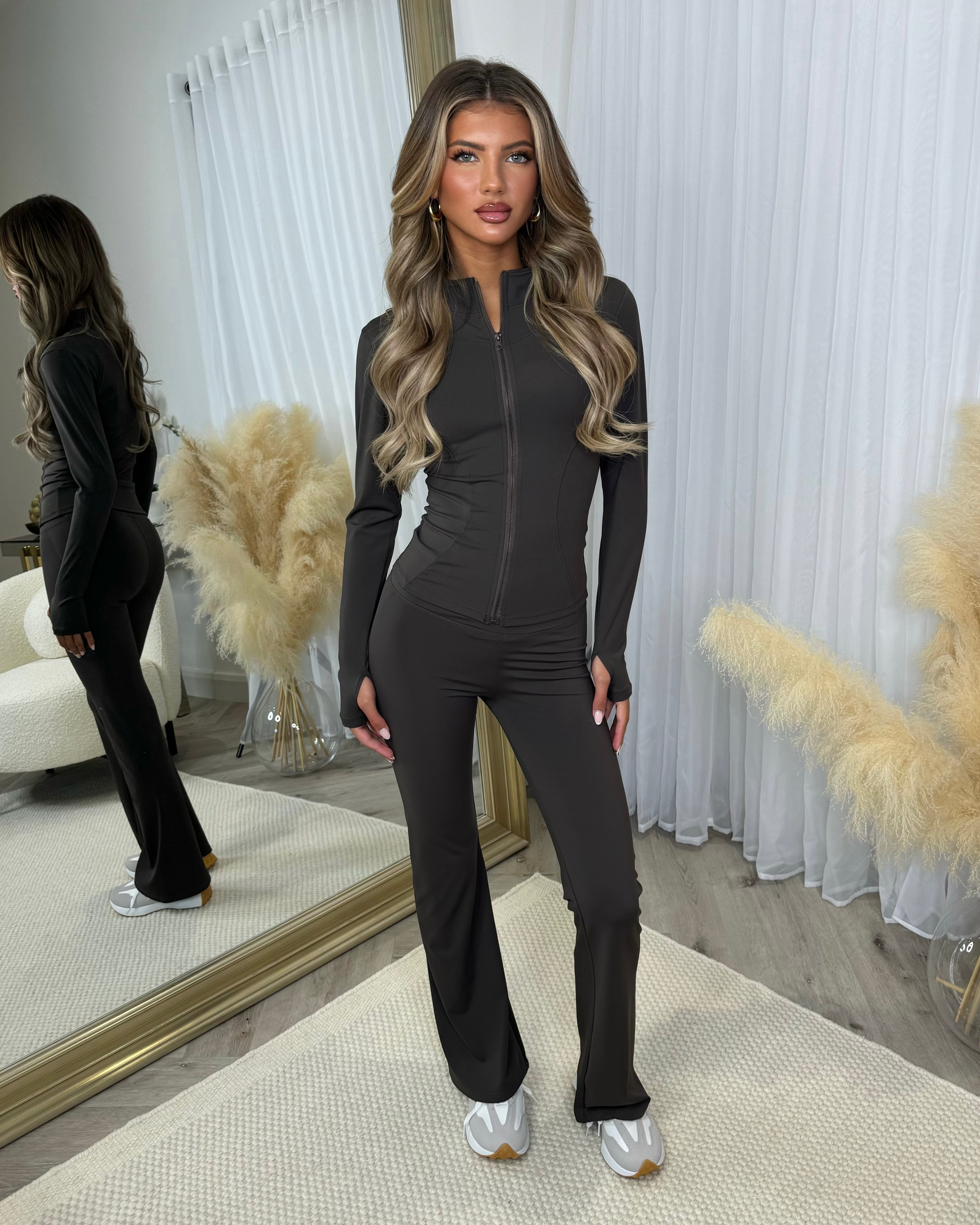 Claire Sculpt Jacket & Flared Trouser Set- Chocolate