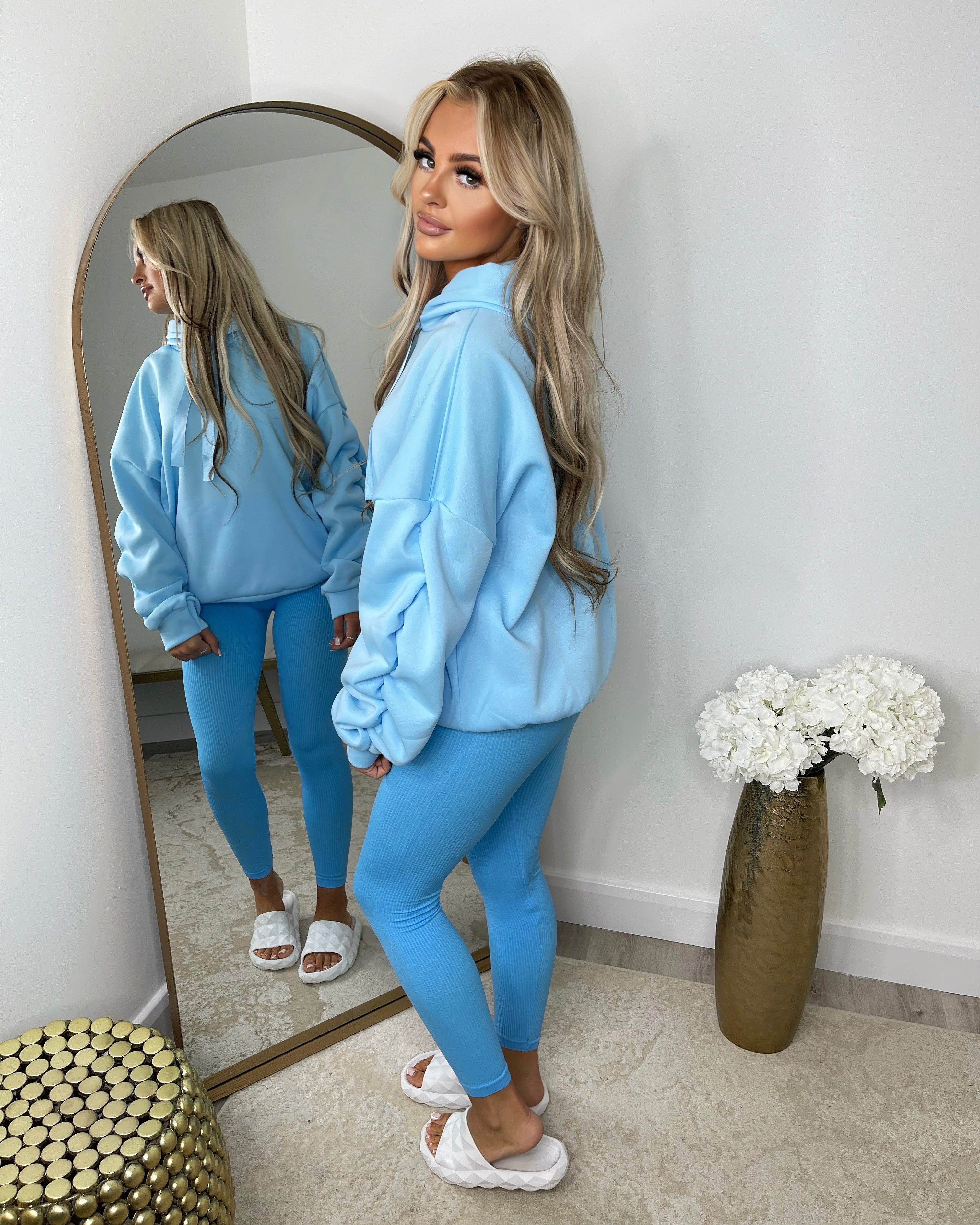 Rachael Ruched Sleeve Hoodie with Ribbon Detail - Baby Blue