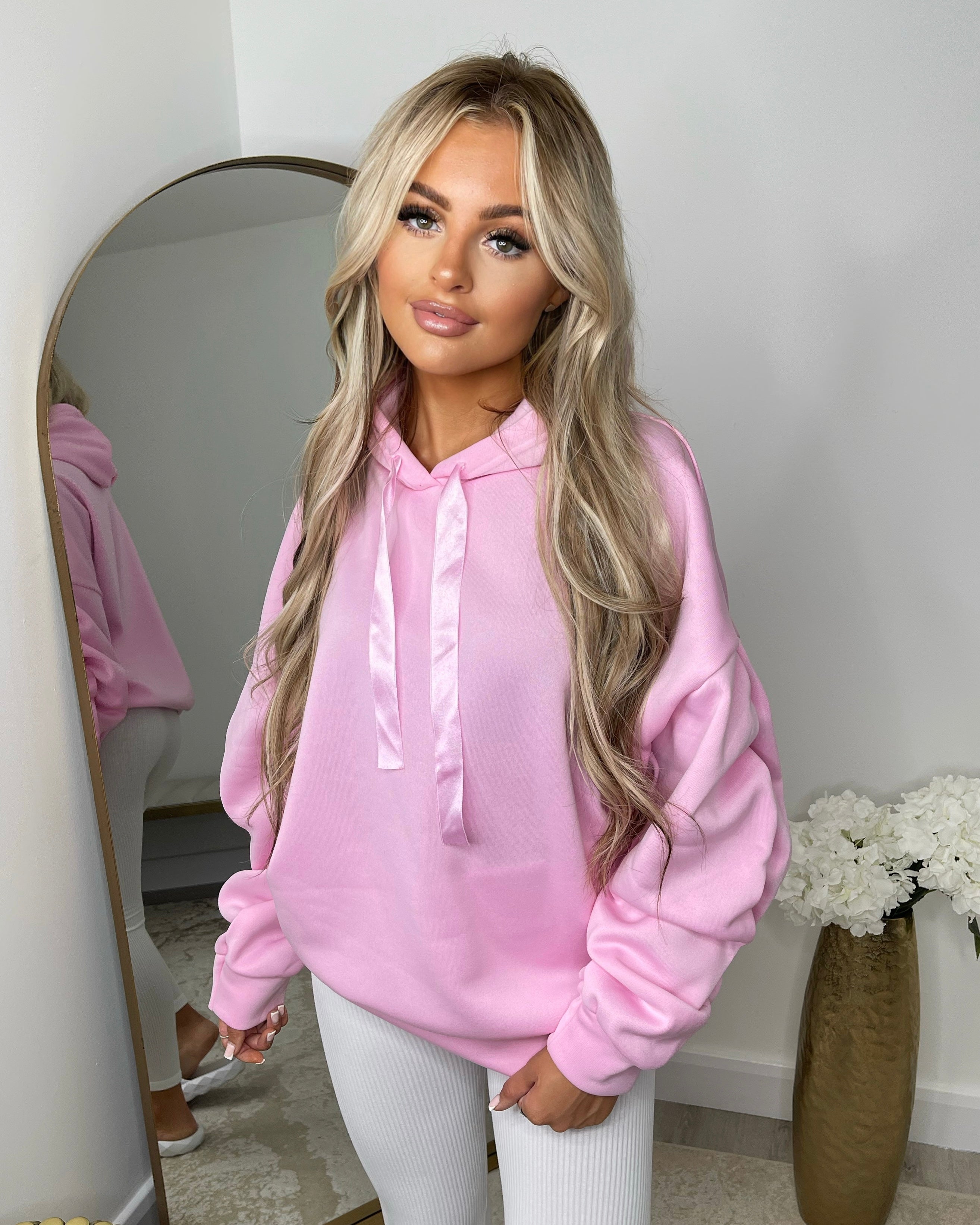 Rachael Ruched Sleeve Hoodie with Ribbon Detail - Baby Pink