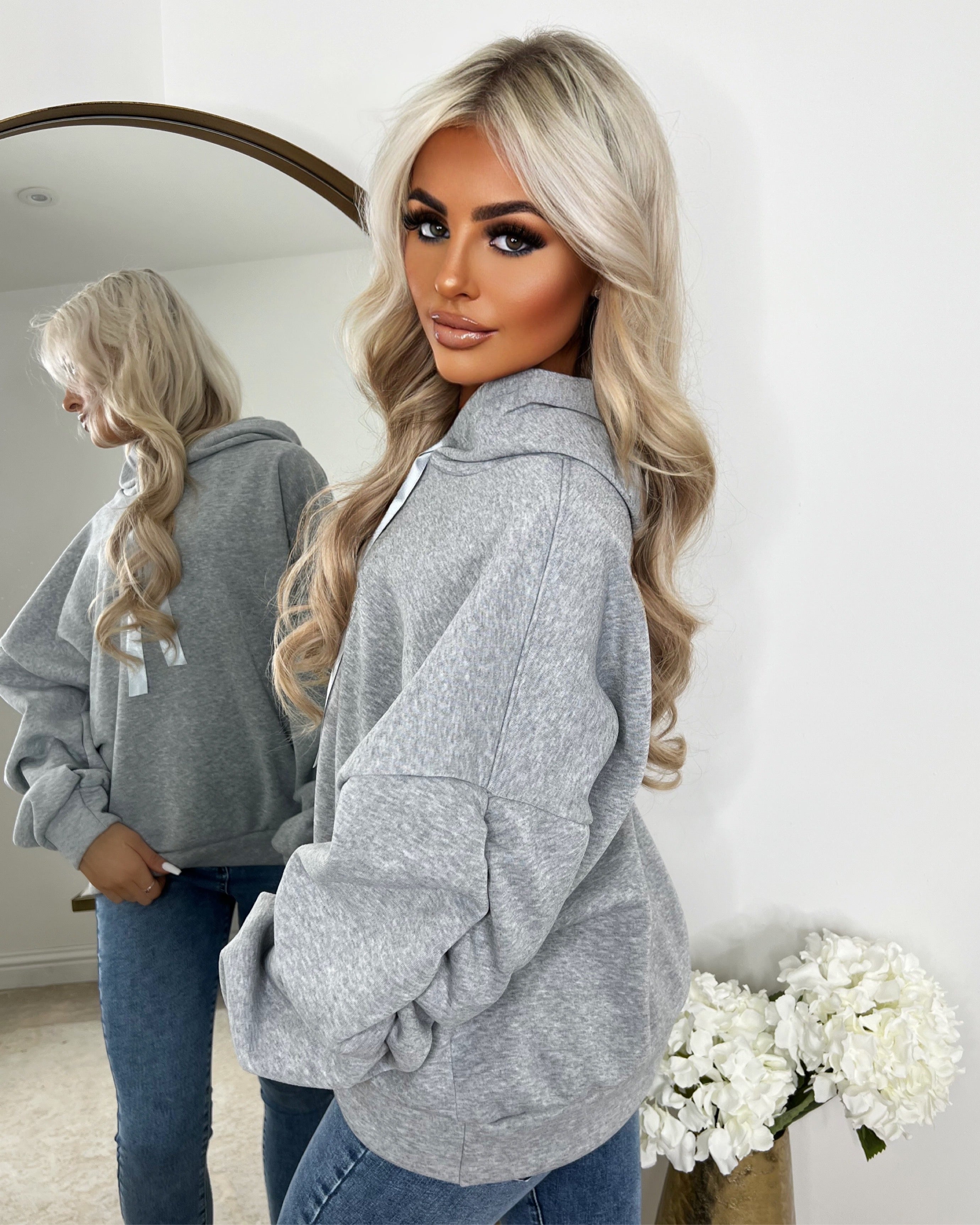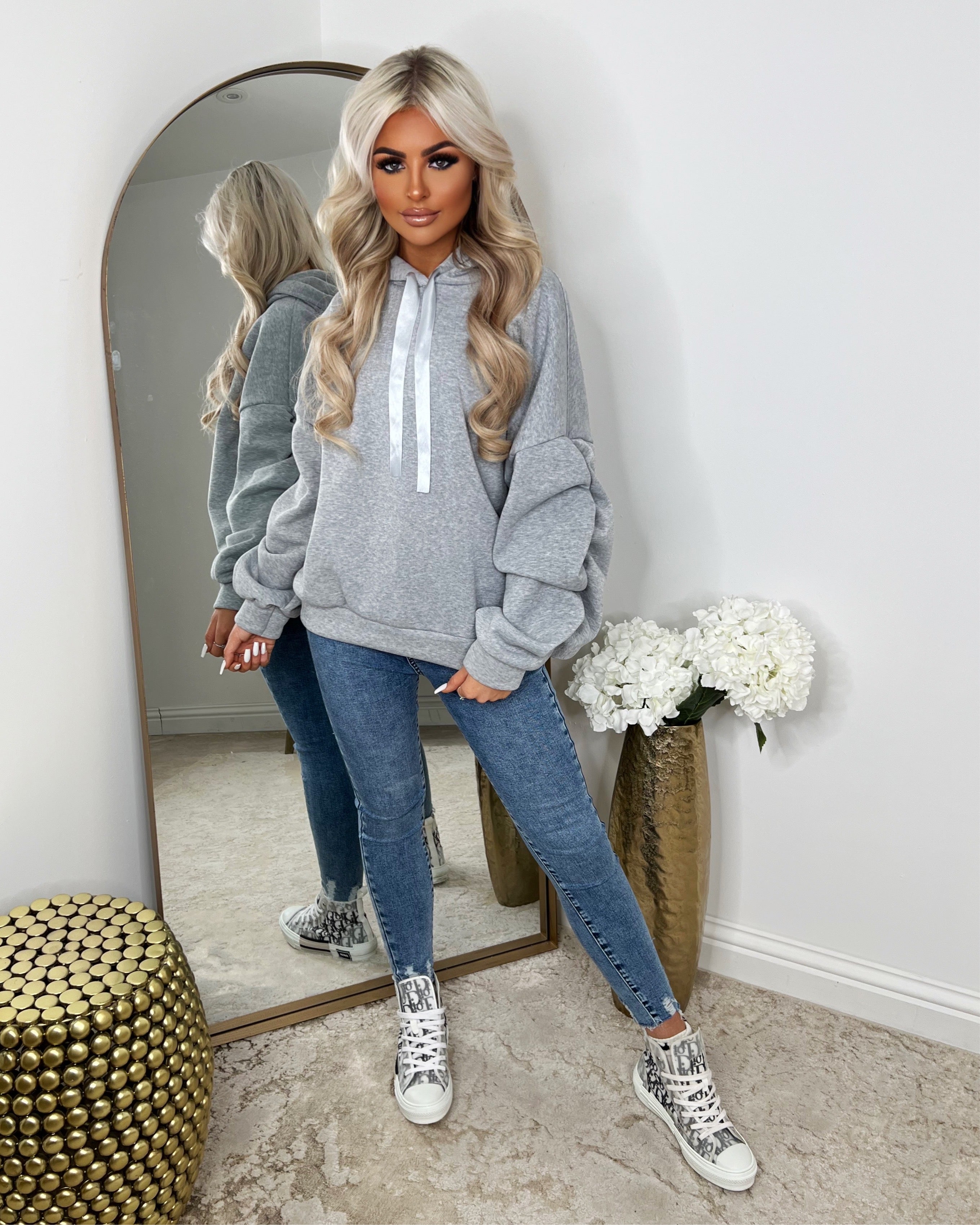 Rachael Ruched Sleeve Hoodie with Ribbon Detail - Grey