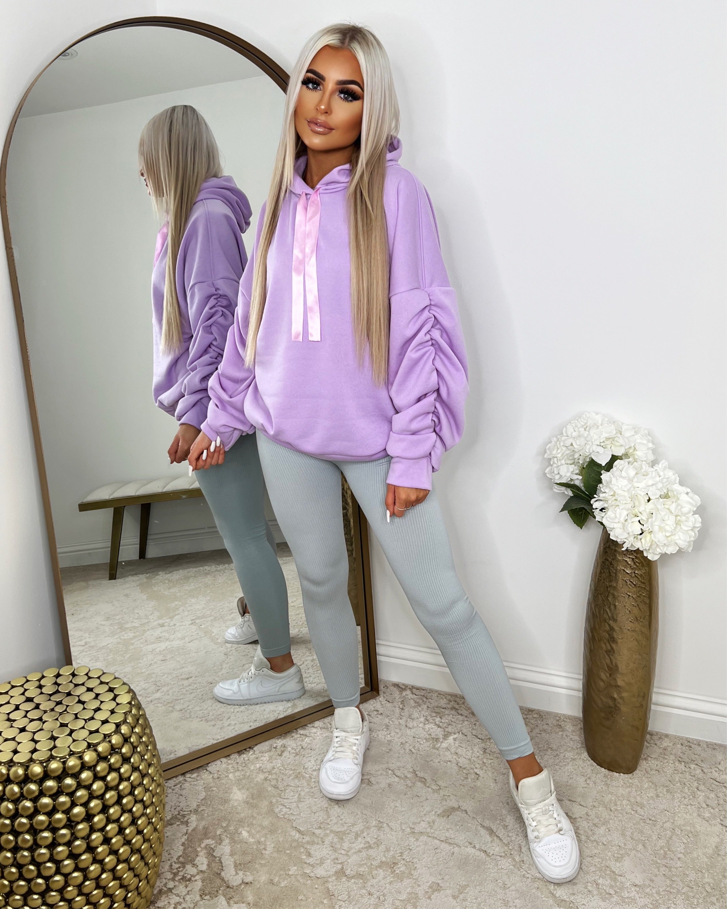 Rachael Ruched Sleeve Hoodie with Ribbon Detail - Lilac